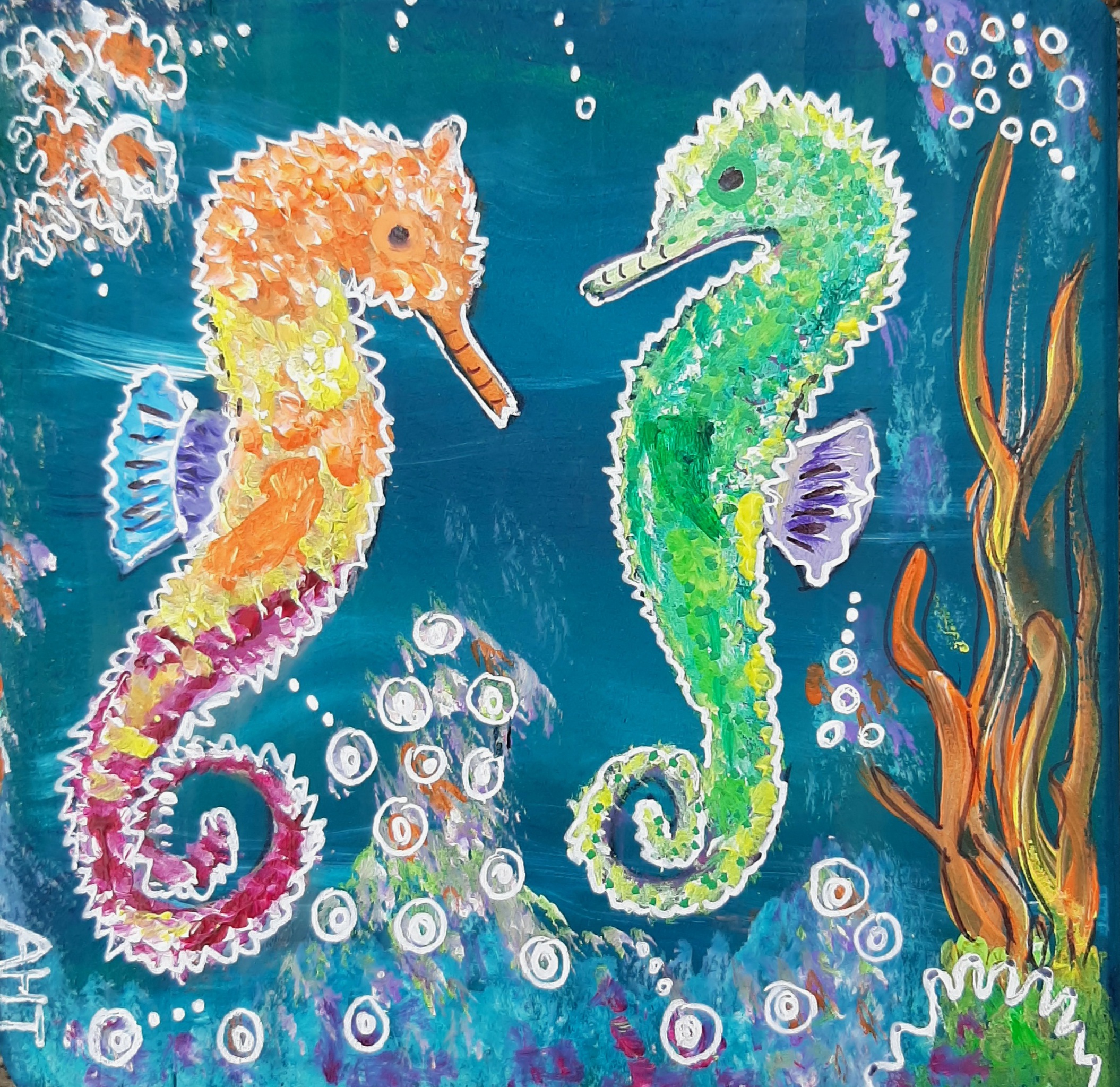 Schilderijtje op hout 2 kleurrijke zeepaardjes in vrolijk acryl