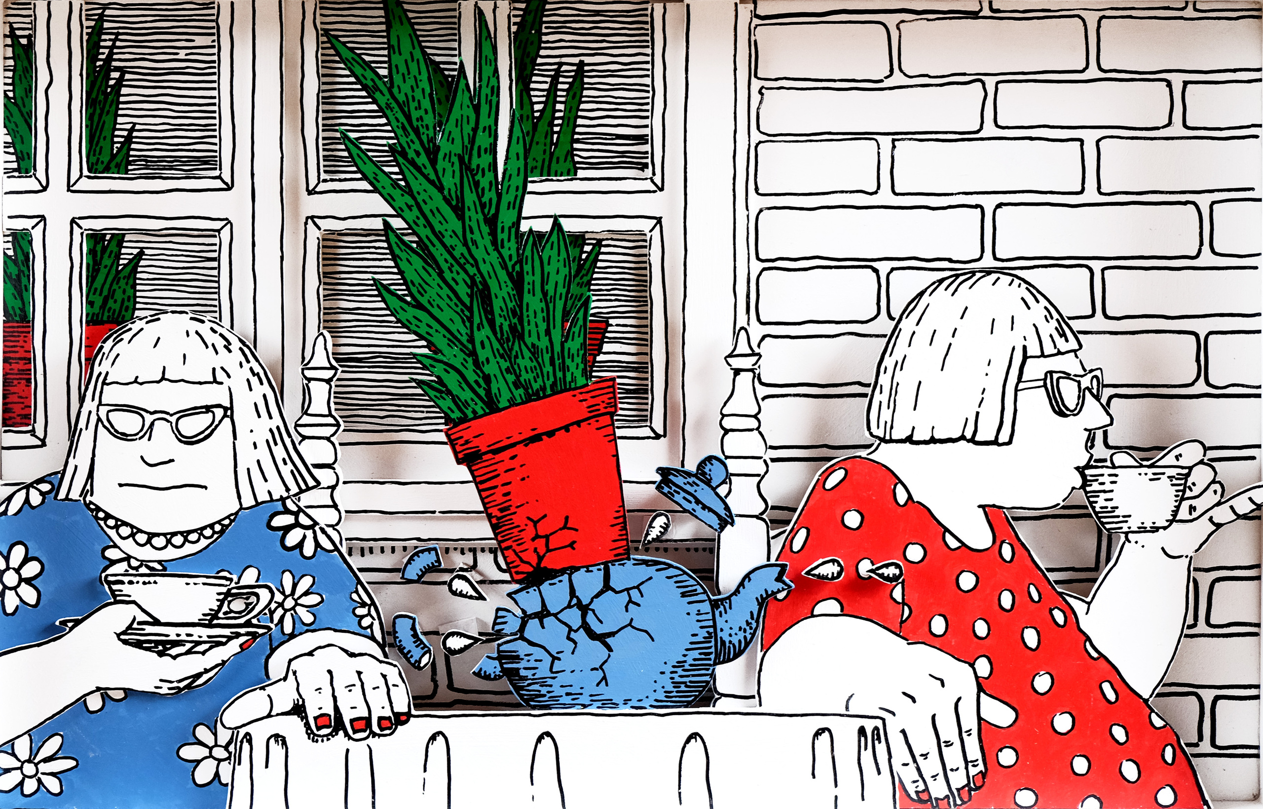 De sanseveria is eindelijk op de begane grond aangekomen. Door een ongelofelijk toeval treft de sanseveria een daar op een tafel staande theepot. De twee thee drinkende dames zijn zich nog niet bewust van de traumatische ervaring die ze minder dan 1 seconde later zullen opdoen en die hun leven blijvend zal veranderen. Maar dat is een ander avontuur.