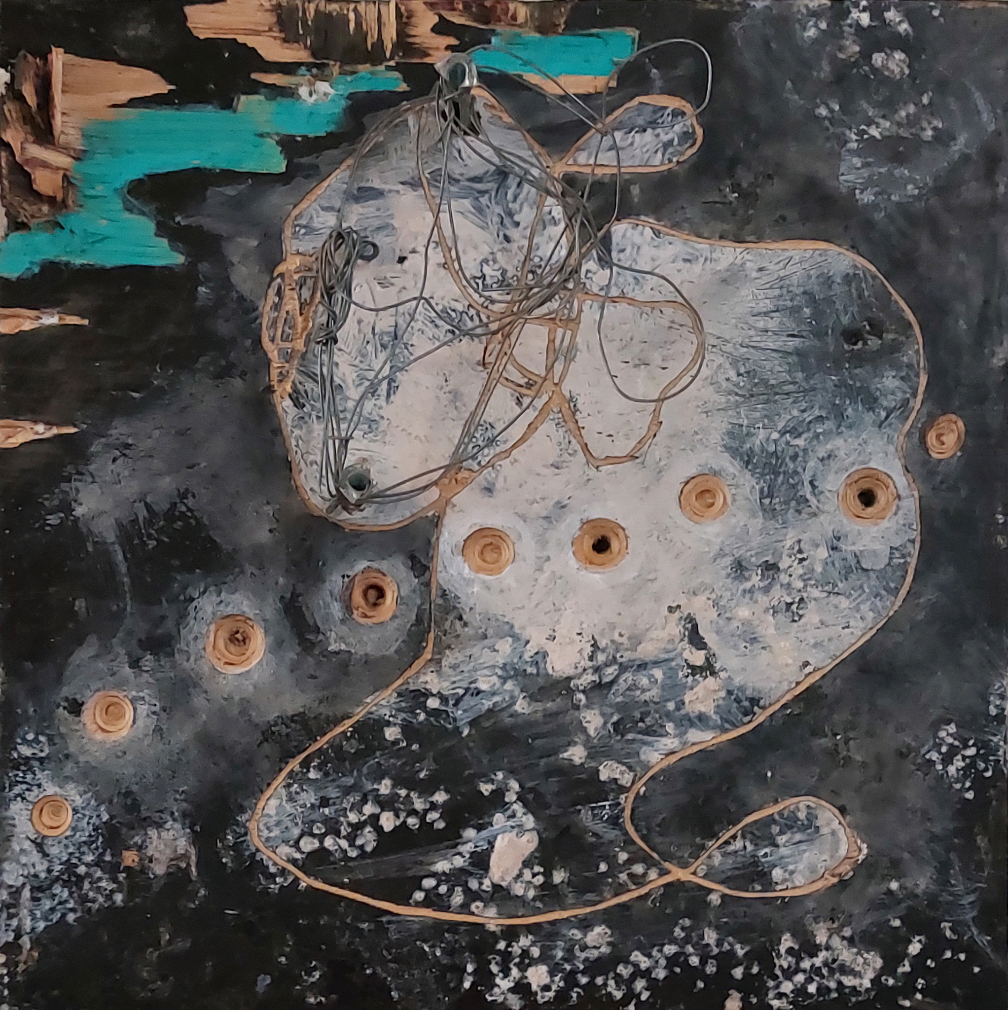 Iets in de buitenwereld intrigeert mij en door deze impressie uit te werken wordt zij blijvend deel van mijn binnenwereld. Laag na laag bouw ik aan de uiteindelijke vorm. Tijdens het werken komt er een stroom van associaties op gang. Het is een constant zoeken naar evenwicht tussen de verf en de andere materialen.