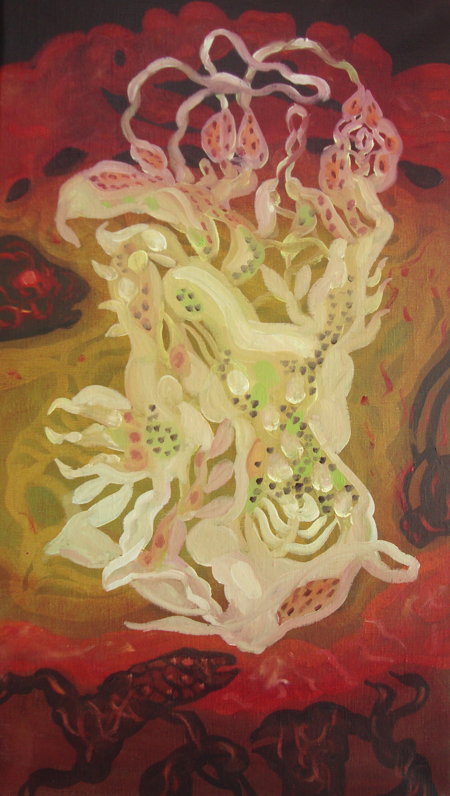Uit serie schepsels en organismen. Transparant organisme onder water met in het donkere deel visachtige diertjes.. Langwerpig schilderij. Voorzien van en beschemend mat vernis.