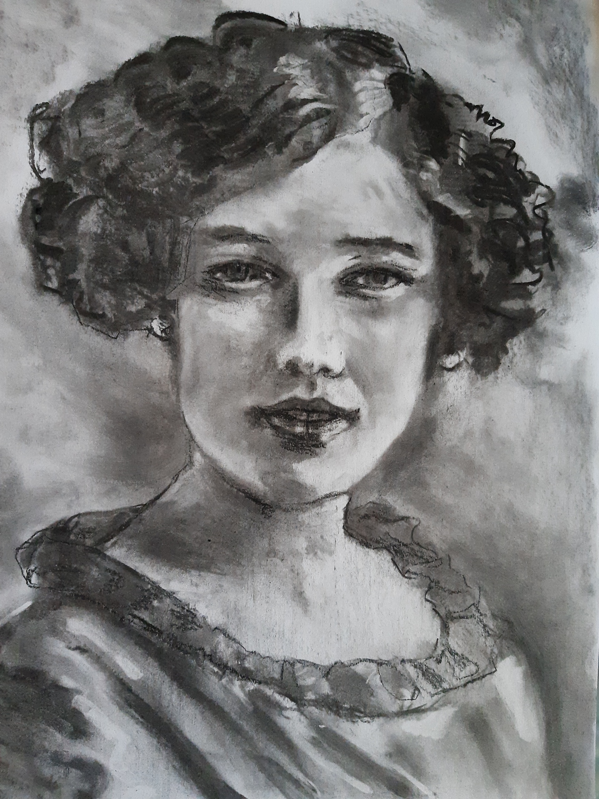 Houtskooltekening naar vintage foto. Ik zoek naar het avontuur in het aanbrengen en wegschrapen van het materiaal.