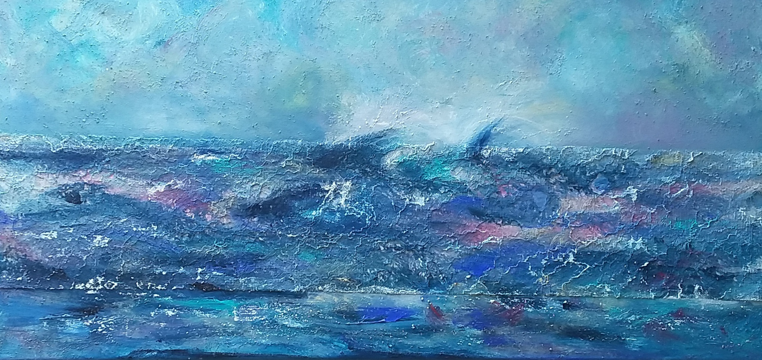 Mixed media,textiel,zand, olieverf aangebracht met ruwe bortsels en paletmes.
