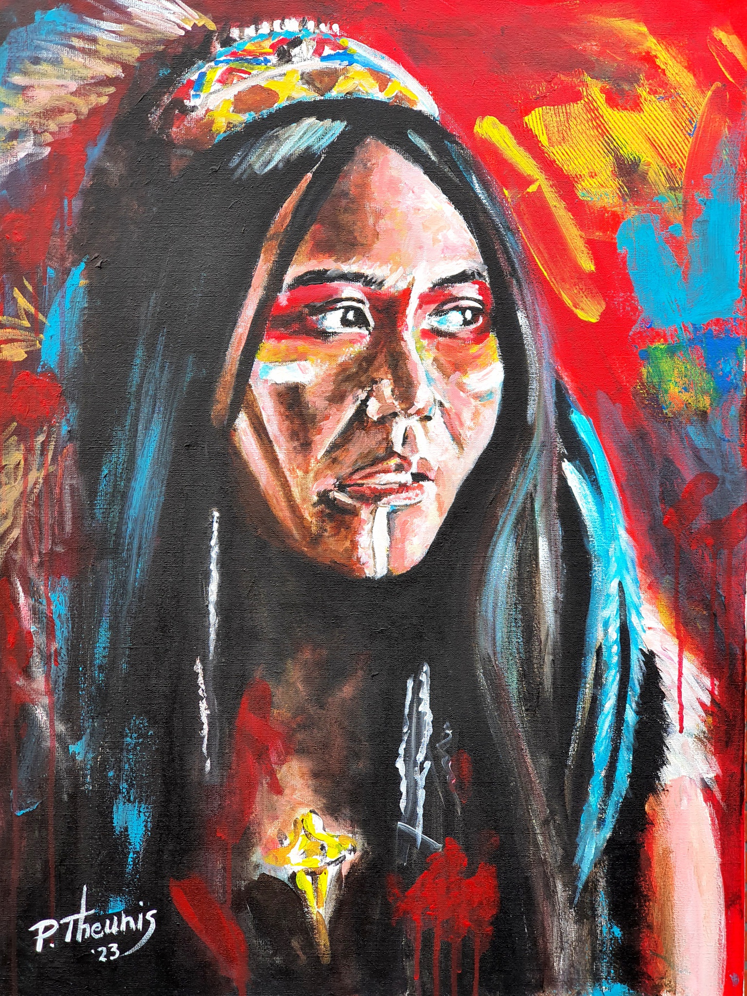 Portret van een vrouwelijke sjamaan in acrylverf.