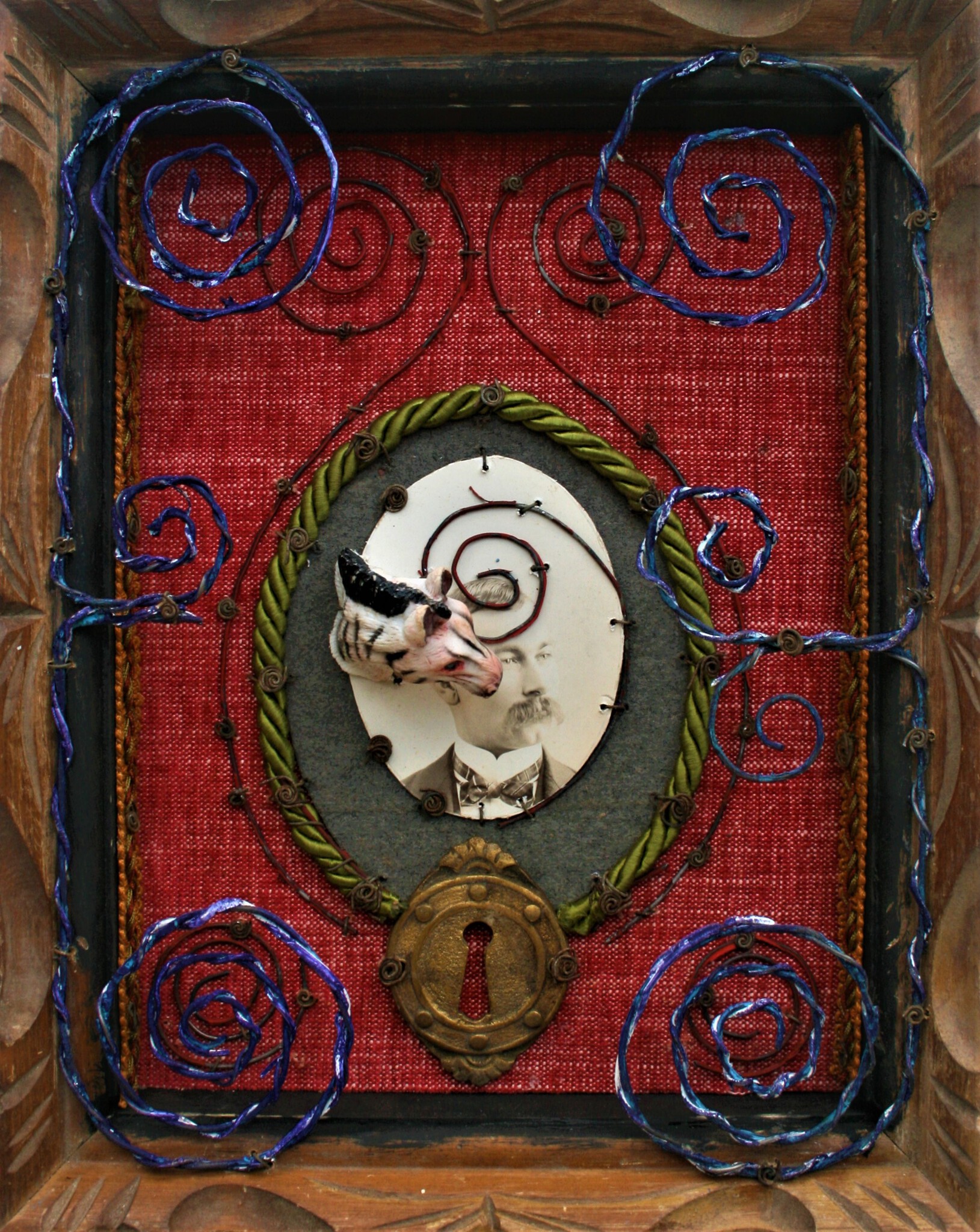 Antieke foto in originele lijst, bewerkt, ijzerdraad, acryl, collage, en uitdrukkelijk geïnspireerd (deze en de volgende) door wat men "kloosterarbeid/klosterarbeid" noemt