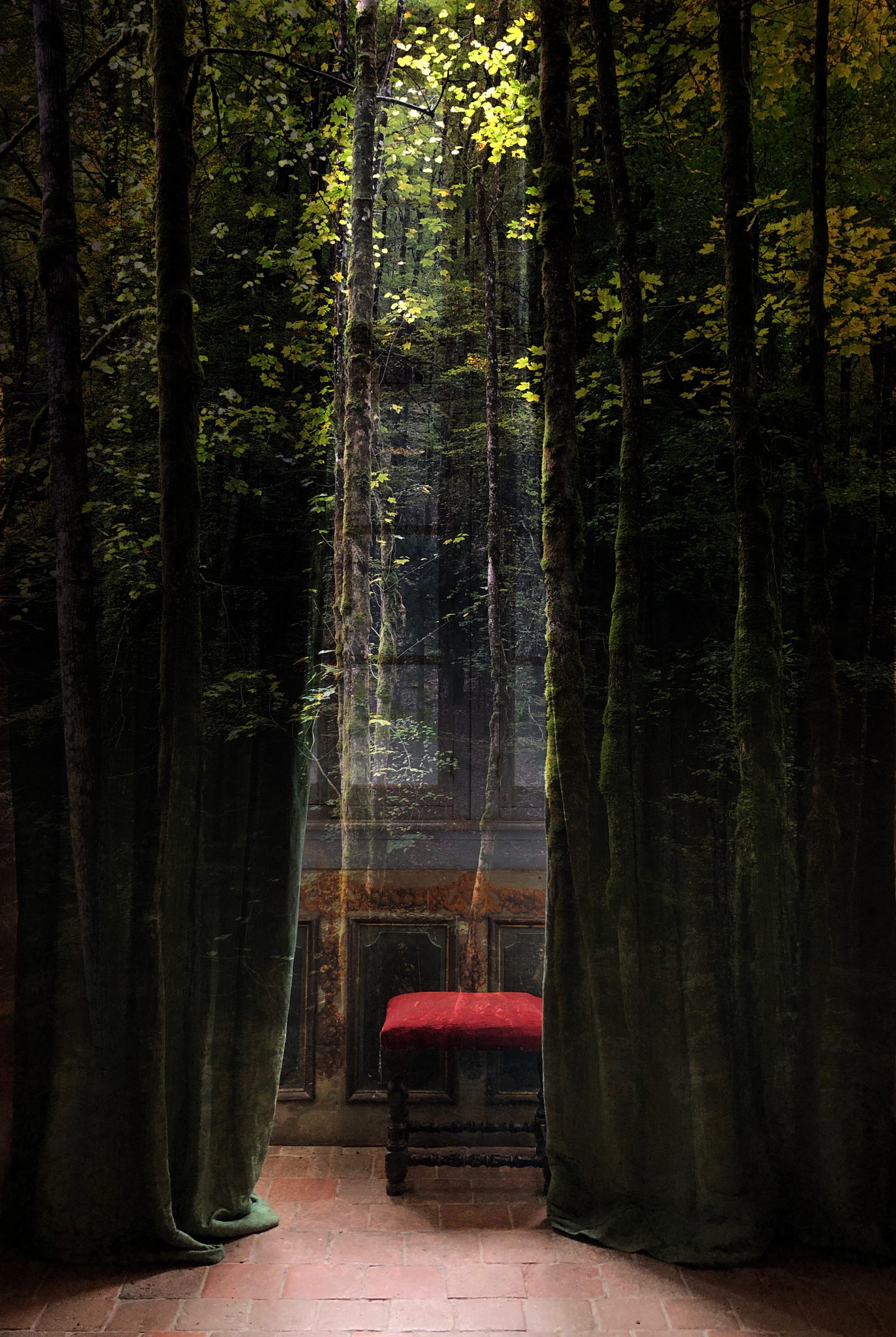 Rood Groen Natuur Bladeren Bomen Bos Buiten Binnen Cultuur Reizen Ramen Natuurlijk Gordijn Kamer Onderdeel Kruk Velours Plooien Fluweel Buitenstaander Bedekken Toekijken Afschermen