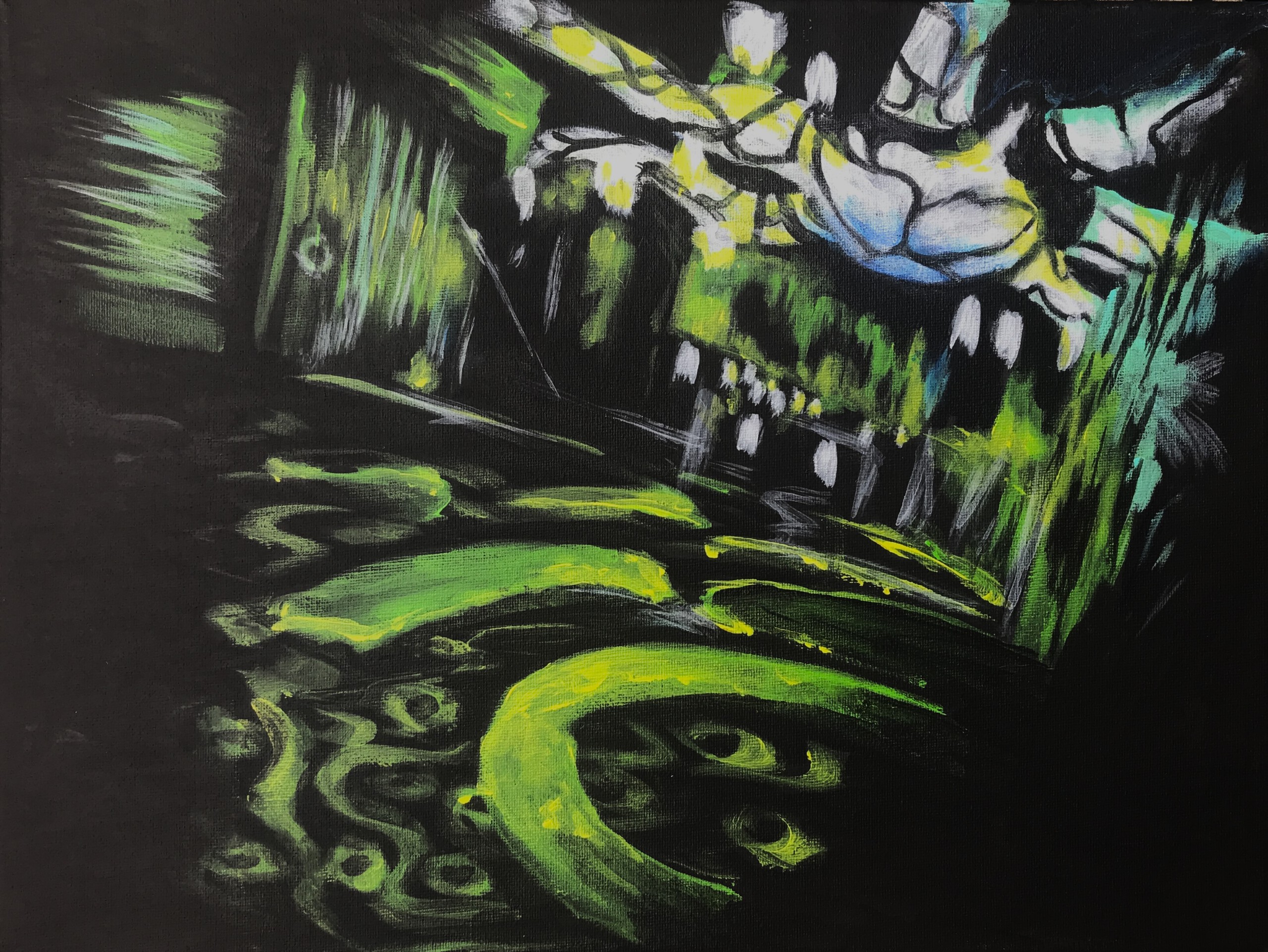Interieur van de iconisch coffeeshop Checkpoint in Terneuzen. "Coffeeshop Checkpoint" is een schilderij uit de serie "Terneuzen, a post coffeeshop city" dat verhaalt over de teloorgang van een kleine havenstad na de sluiting van de iconische coffeeshop Checkpoint. De schilderijen in deze serie zijn gemaakt op gerecycelde low budget doeken met hier en daar nog duidelijke sporen van de vorige functie zoals gaatjes en reliëf, verwijzend naar de verloedering van de Terneuzense binnenstad en als pleidooi voor het herstellen en hergebruk van bestaande materialen in plaats van weggooien. Dit laatste als protest tegen de afbraak van de oude gebouwen en vervangen met nieuwe zoals sinds de sluiting van Checkpoint de trent is. Wat ten gevolge heeft gehad dat het karakteristieke straatbeeld maar ook de cohesie in de stad compleet verstoord is geraakt en de leefbaarheid steeds verder af is gaan glijden.