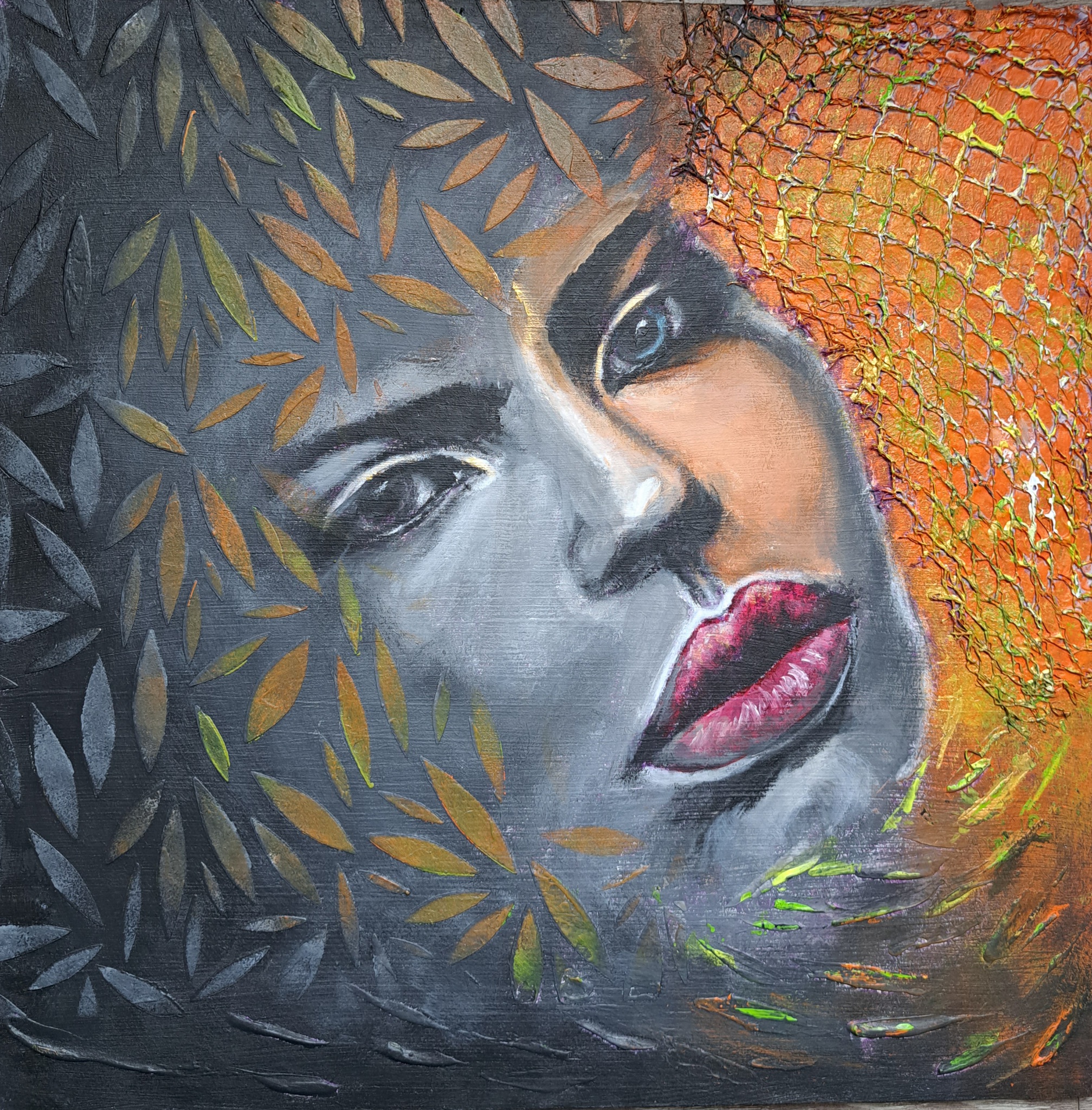 Portret met structuur. Mixed media op paneel. Dit paneel is op te hangen in een punt.