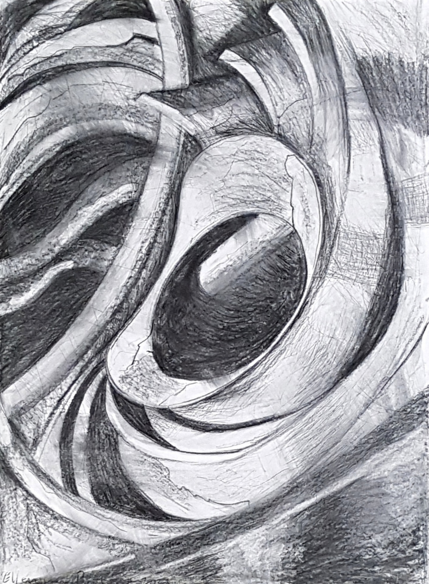 Syklus - vier grote houtskooltekeningen als installatie in kokervormen opgesteld, geïnspireerd op Frank Stella's Broken Jug.