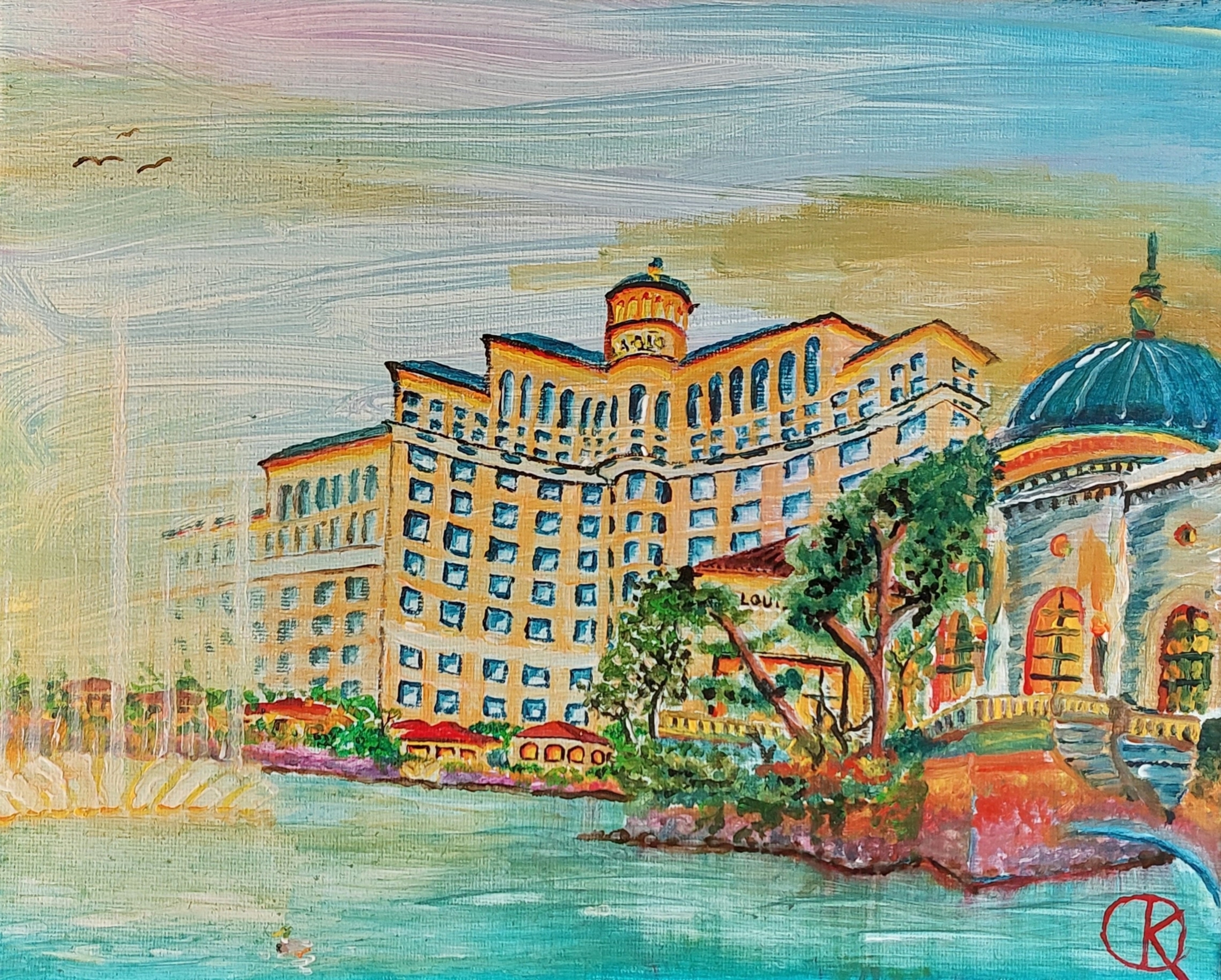 Dit is een schilderij van het beroemde hotel en casino, Bellagio, in Las Vegas. Bellagio staat bekend om zijn waterorgel in de vijver pal voor het hotel. Links in het schilderij heb ik het beroemde waterorgel afgebeeld. In het midden van het schilderij is het hotel zelf te zien.