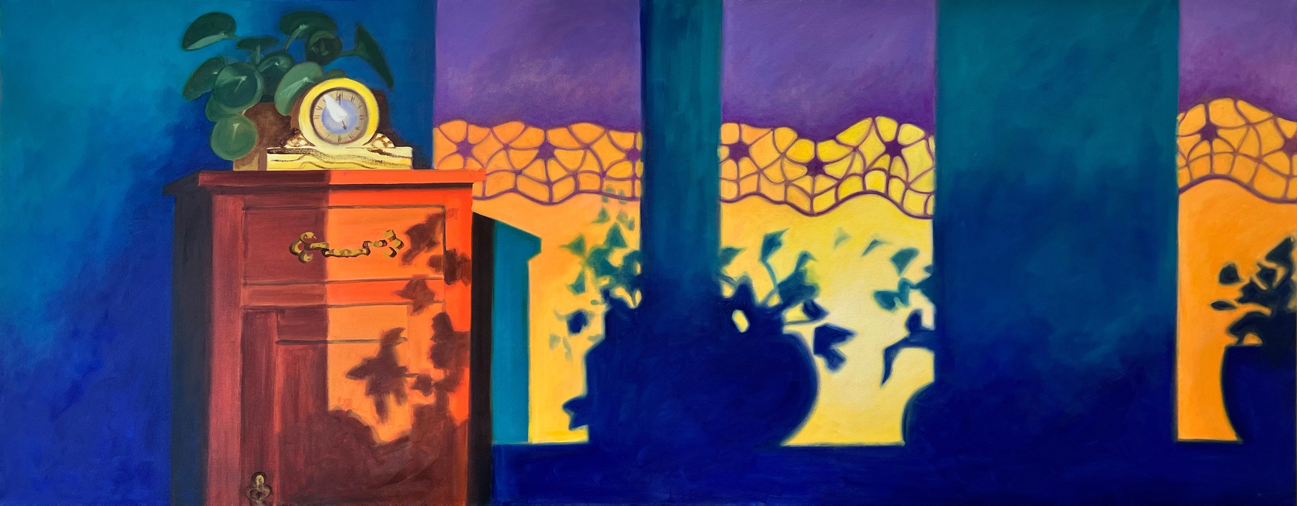 Olieverf Schilderij Kleurrijk Zonlicht Komorebi Japan Gouden Uur Golden Hour Spiegelingen Reflectie Paars Blauw Geel Ochtendlicht Avondlicht Sasart Sasjabork Minerva Groningen Noordelijk Realisme Sfeer Intiem