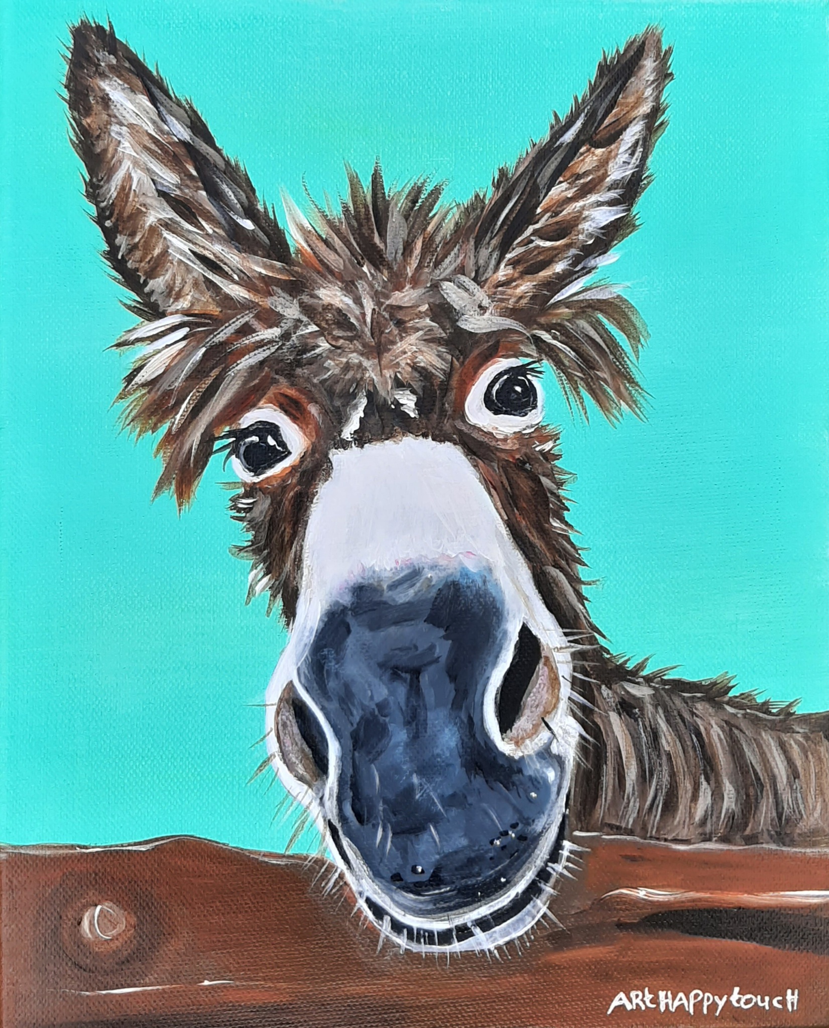 Lief bruin ezeltje op licht (neigt op foto donkerder) mintgroene shabby achtergrond in vrolijk acryl op canvas VERKOCHT