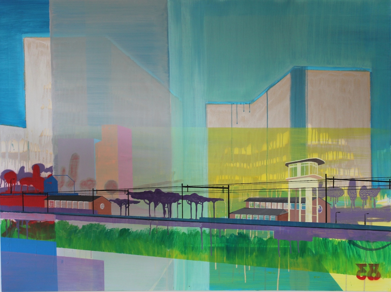Bas de Boer (1973) / Alkmaar Gedreven om te creëren pakt hij na zijn studie aan de kunstacademie (AKI) de kwast weer op. Liefde voor graffiti brengt hem naar een workshop (Steve Locatelli)met ‘spraycans’. Het strakke en snelle werken met een ‘spraycan’ combineert heerlijk met de lome en soms druipende waterige acryl. Op het doek ontstaan kleurrijke interpretaties van stedelijke en industriële landschappen met architectuur en perspectief.