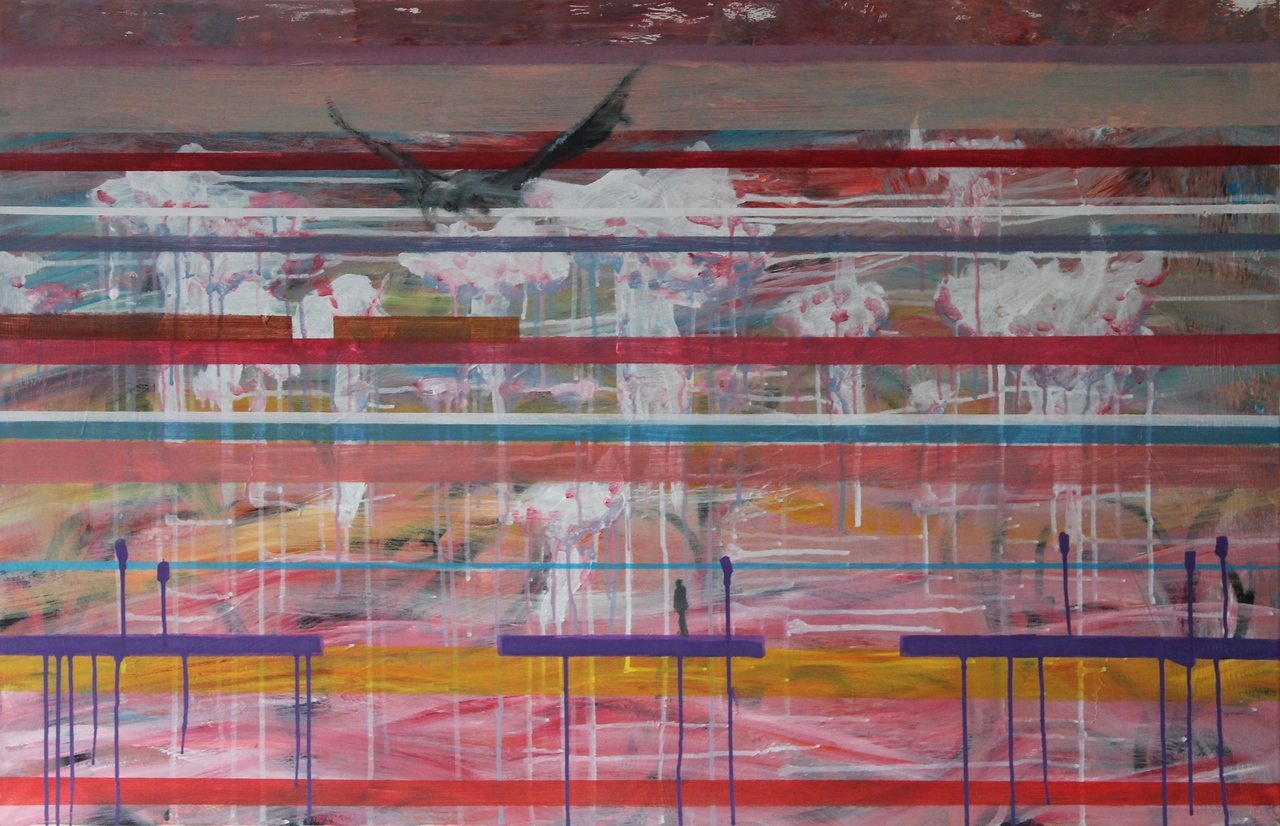 Bas de Boer (1973) / Alkmaar Gedreven om te creëren pakt hij na zijn studie aan de kunstacademie (AKI) de kwast weer op. Liefde voor graffiti brengt hem naar een workshop (Steve Locatelli)met ‘spraycans’. Het strakke en snelle werken met een ‘spraycan’ combineert heerlijk met de lome en soms druipende waterige acryl. Op het doek ontstaan kleurrijke interpretaties van stedelijke en industriële landschappen met architectuur en perspectief.