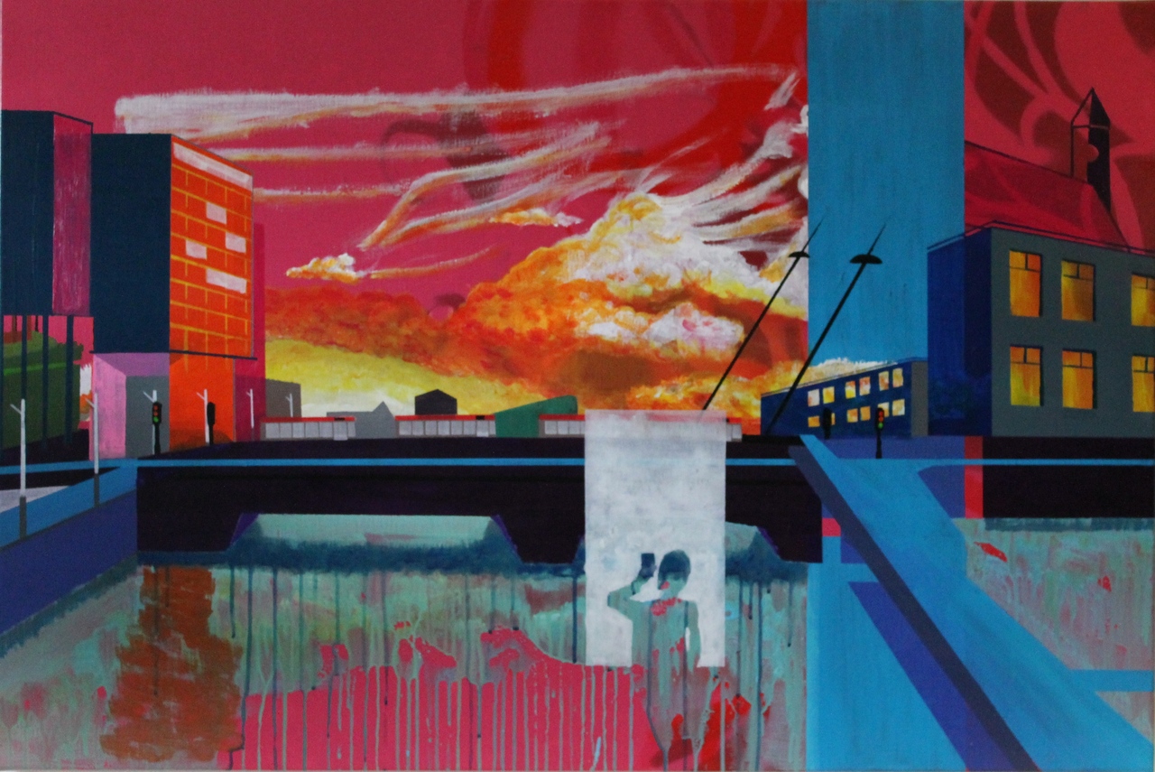 Bas de Boer (1973) / Alkmaar Gedreven om te creëren pakt hij na zijn studie aan de kunstacademie (AKI) de kwast weer op. Liefde voor graffiti brengt hem naar een workshop (Steve Locatelli)met ‘spraycans’. Het strakke en snelle werken met een ‘spraycan’ combineert heerlijk met de lome en soms druipende waterige acryl. Op het doek ontstaan kleurrijke interpretaties van stedelijke en industriële landschappen met architectuur en perspectief.