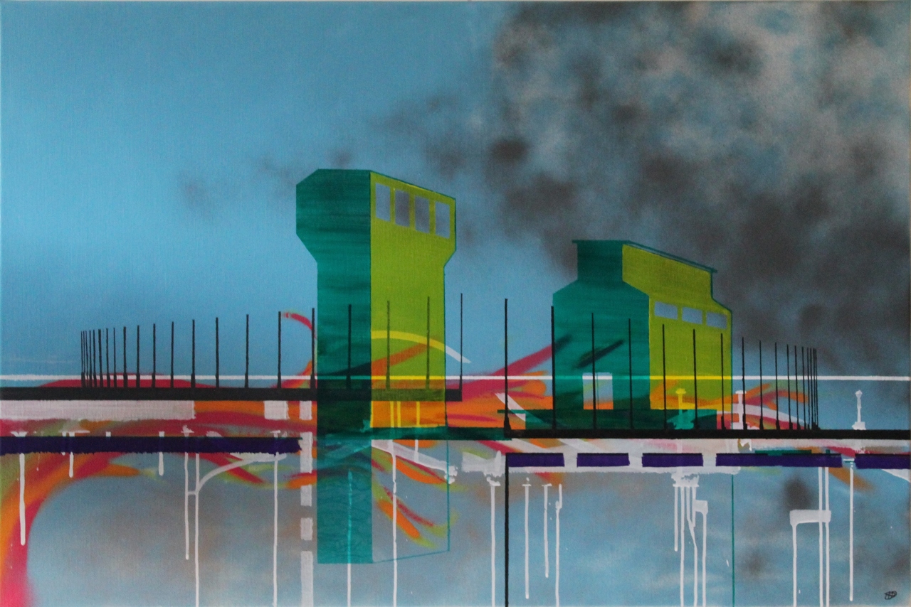 Bas de Boer (1973) / Alkmaar Gedreven om te creëren pakt hij na zijn studie aan de kunstacademie (AKI) de kwast weer op. Liefde voor graffiti brengt hem naar een workshop (Steve Locatelli)met ‘spraycans’. Het strakke en snelle werken met een ‘spraycan’ combineert heerlijk met de lome en soms druipende waterige acryl. Op het doek ontstaan kleurrijke interpretaties van stedelijke en industriële landschappen met architectuur en perspectief.