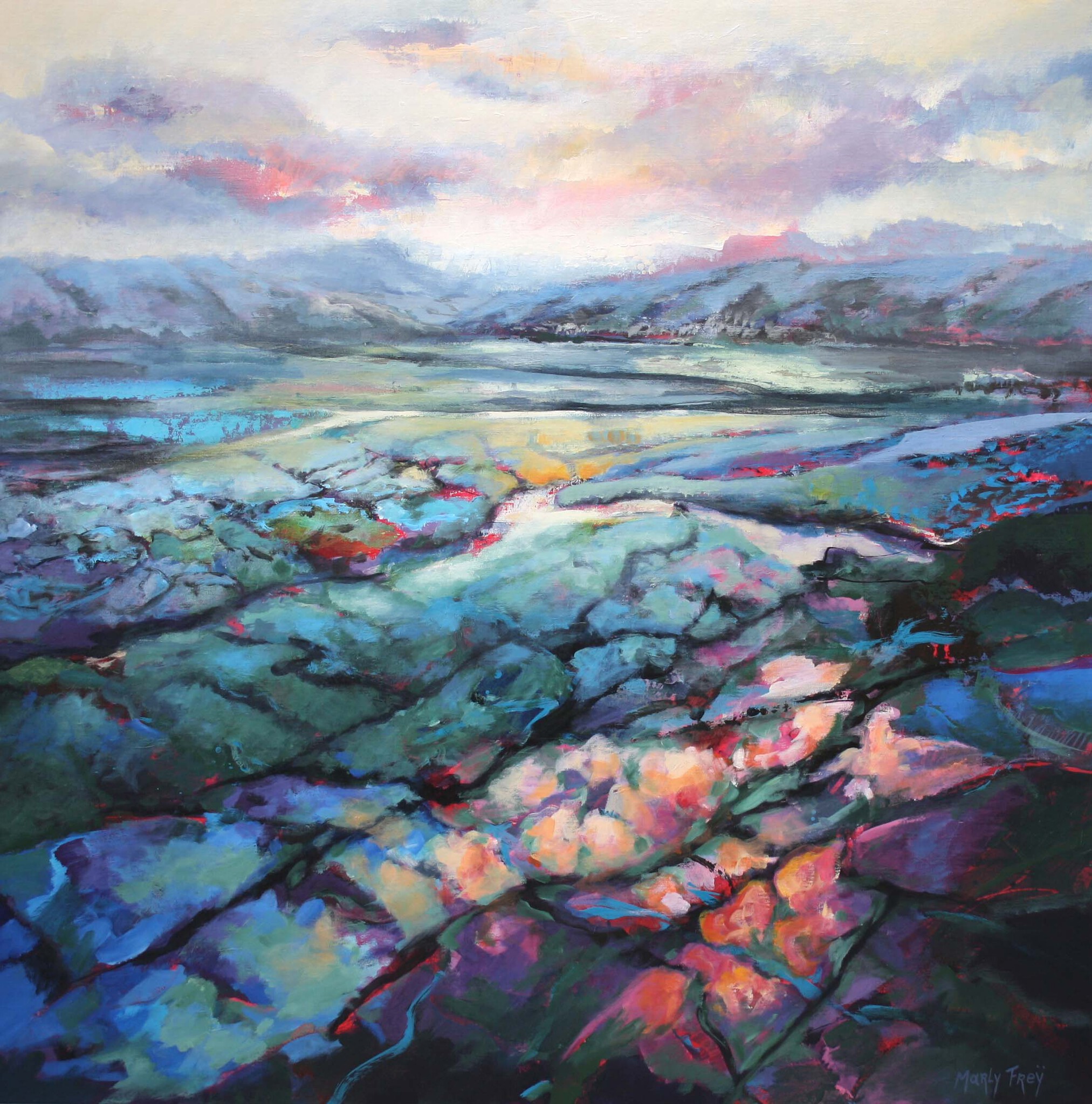 Marly Freij maakt grote kleurrijke, maar ook meer ingetogen schilderijen in gemengde techniek, met name sferische landschappen en abstracte composities
