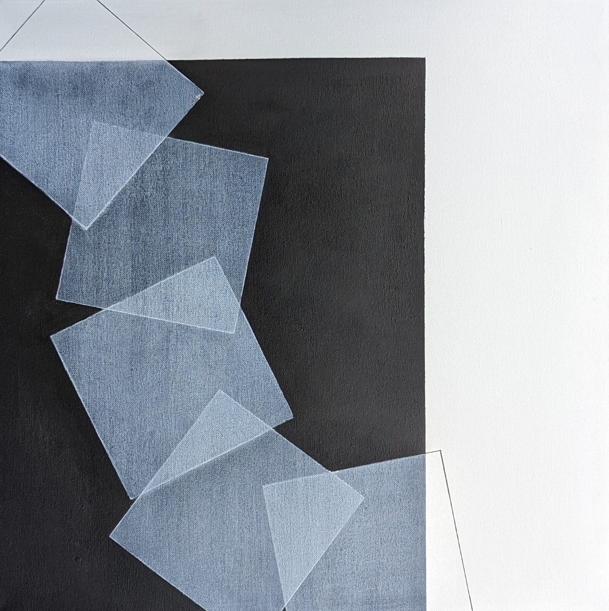 Bijna doorschijnende witte vlakken tuimelen over het zwart/witte doek
