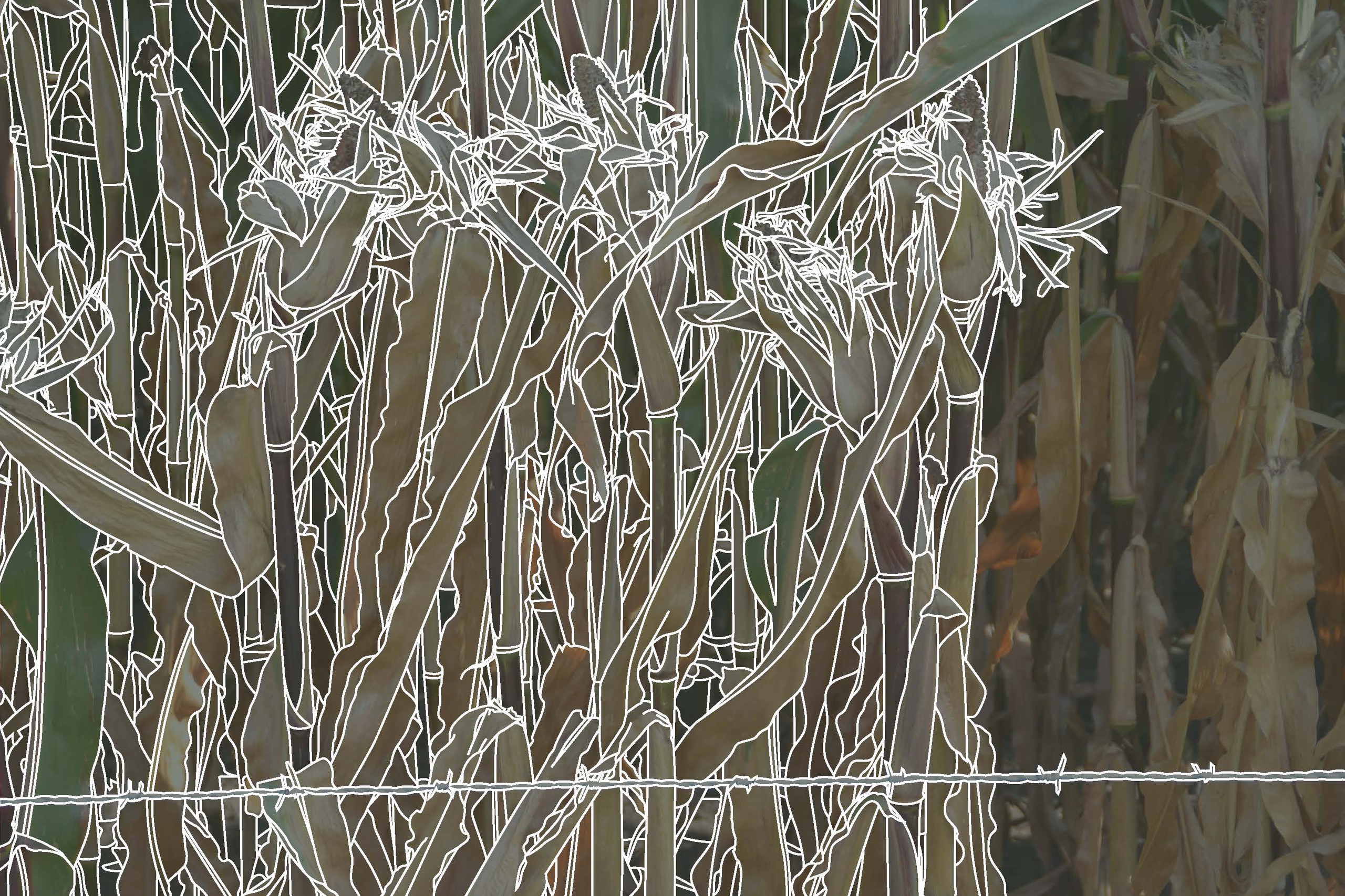 In mijn eerdere werk probeerde ik de grote lijnen in het landschap te pakken door middel van fotocollages. In deze digitale tekening zoom ik in. Ik pak een hoekje van het landschap en registreer. Dit is het derde deel van het vierluik 'Alom Mais', getiteld 'Polderjungle'.