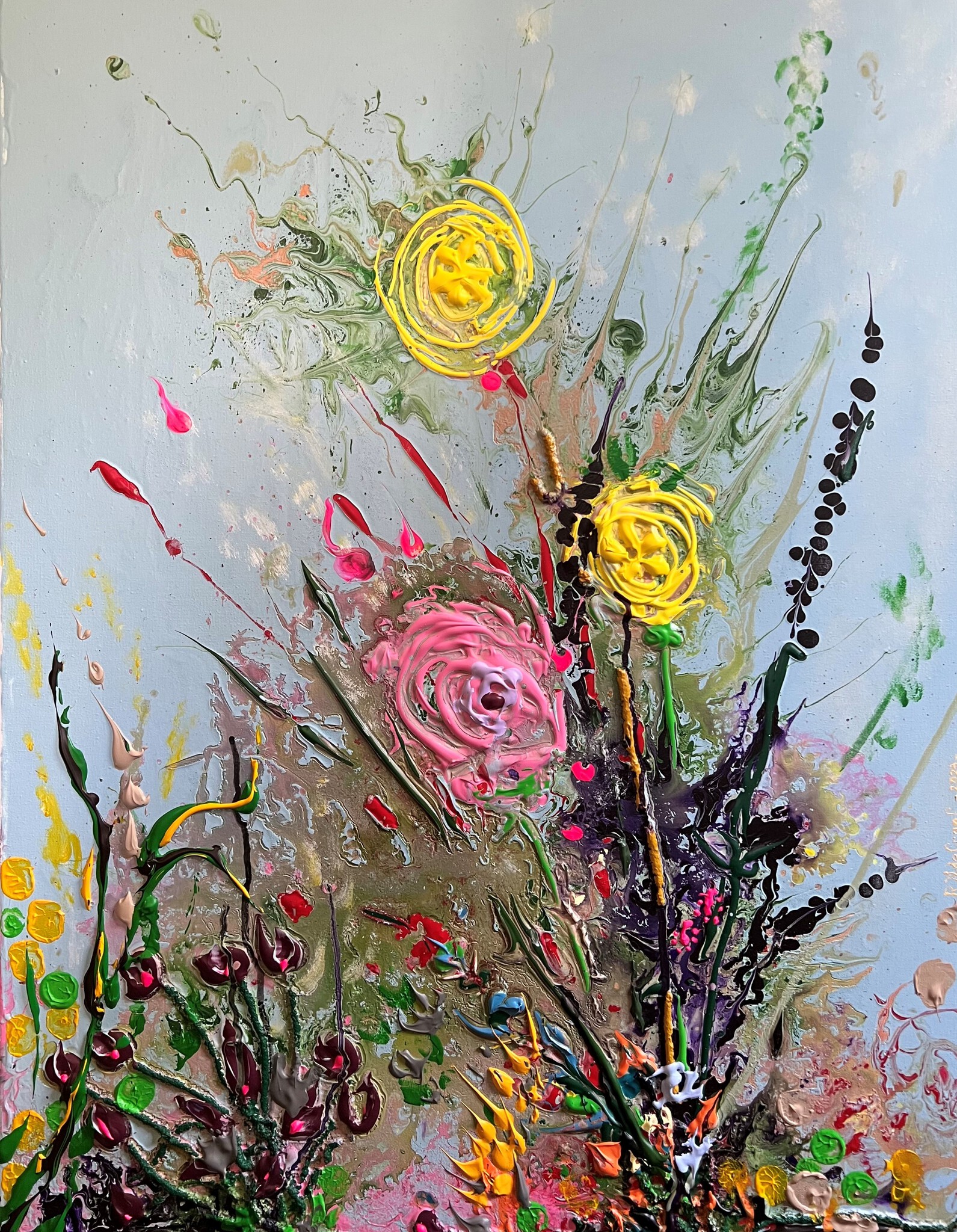 Blauw Acryl Expressief Expressie Bloemen Vaas Kleuren 3d Kleurrijk Dik Doek Op Bloem Effect Plant Kracht Fantasie Takken Bont Stengels Reliëf Nat Plukken Takjes Vloeien