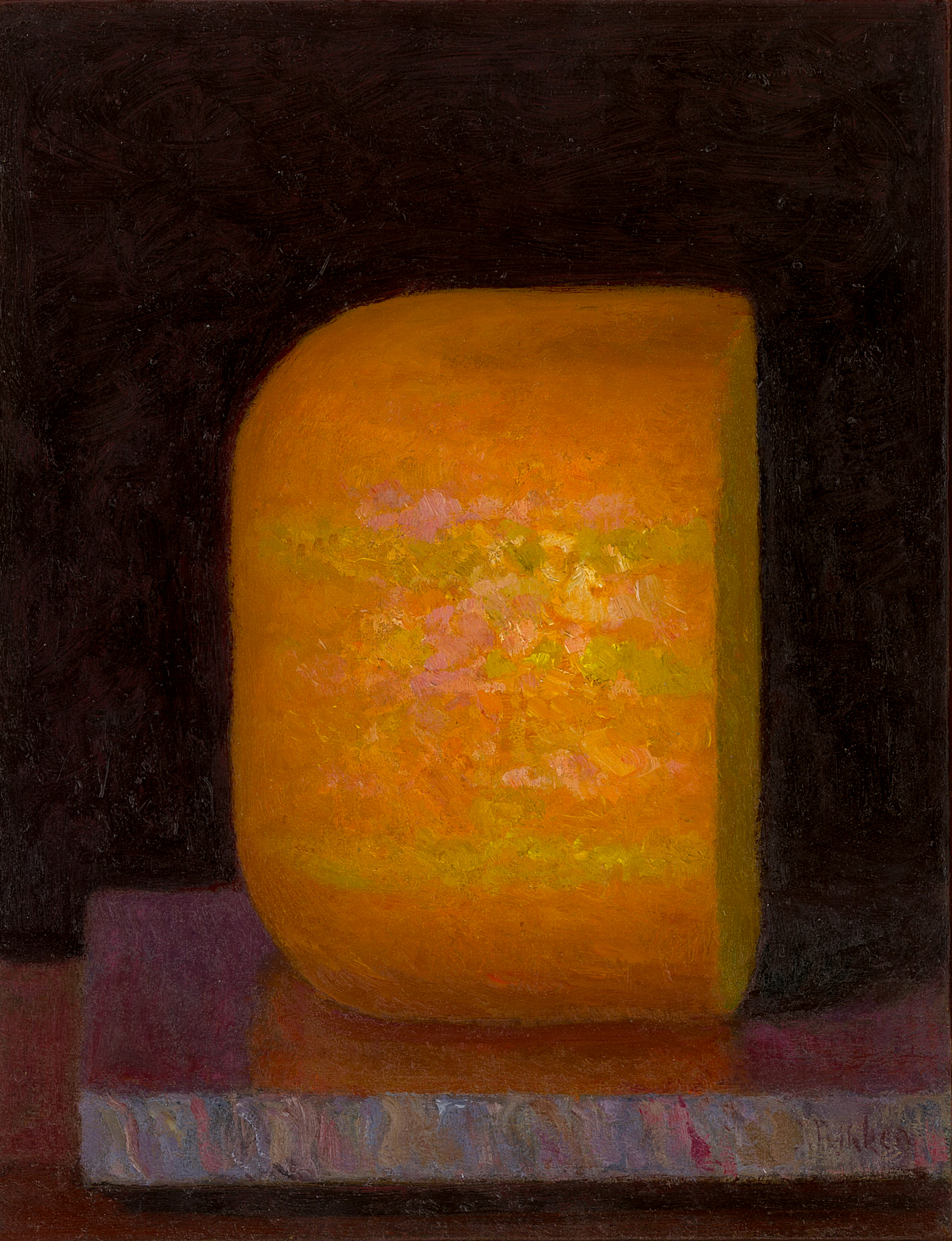 Dit stilleven is er een uit een serie over etenswaren, zoals : vlees, vis, groente, fruit .Wat me er in aantrekt is de schoonheid van het dagelijkse . De stofuitdrukking is natuurlijk een uitdaging voor een schilder als ik. De prachtige kleur van de korst, het transparante geel , tegnover de donkere achtergrond maakt het voor mij een interessant onderwerp. Kijk ook eens op : https://www.benrikken.nl/stillevens