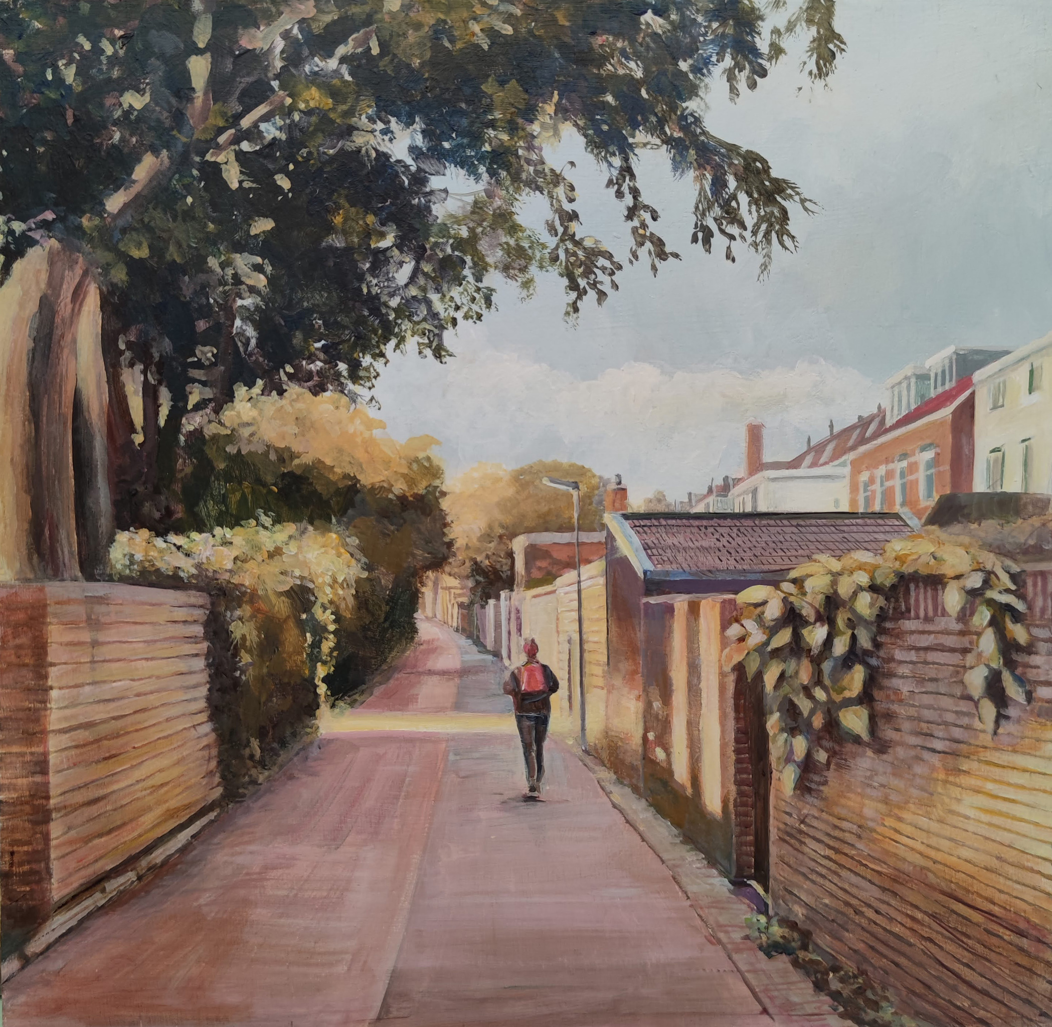 Een wandelaar met rode rugzak loopt over het zonnige Eikbosserpad in Hilversum.
