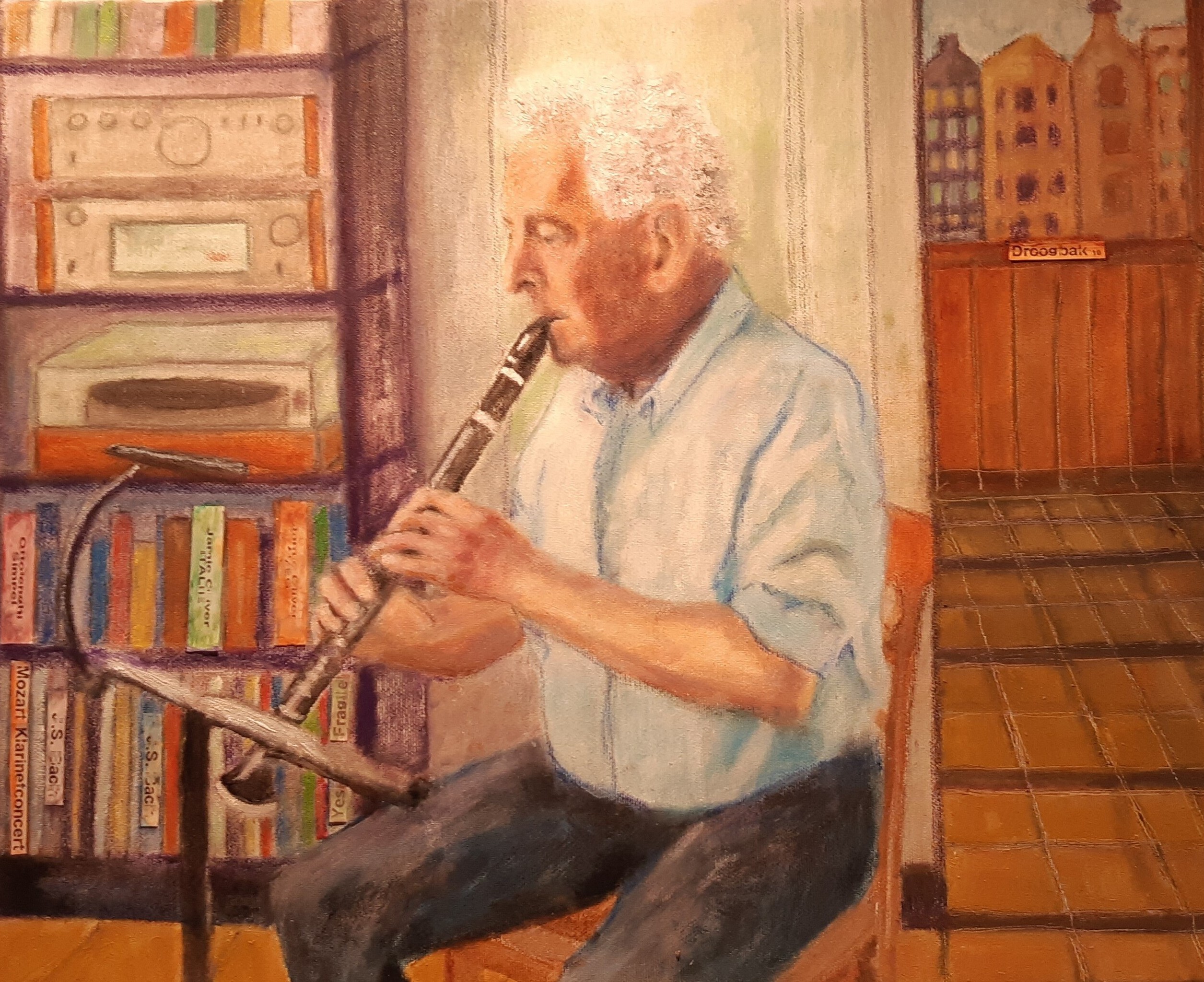 Dit is een zogenaaamd attributenschiderij: eem persoon afgebeeld met zijn of haar hobby's. Olieverf