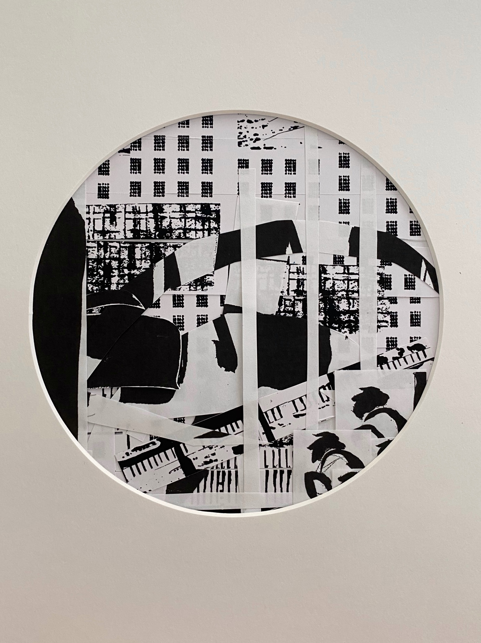 Het gebruik maken van ritmes door te vergroten en te verkleinen. Collage compositie. Zwart rond passepartout daarop wit paspartout 40cm. h x 30cm. b - uitsnede 17cm. Geleverd met zwarte strakke lijst..Beschikbaar.