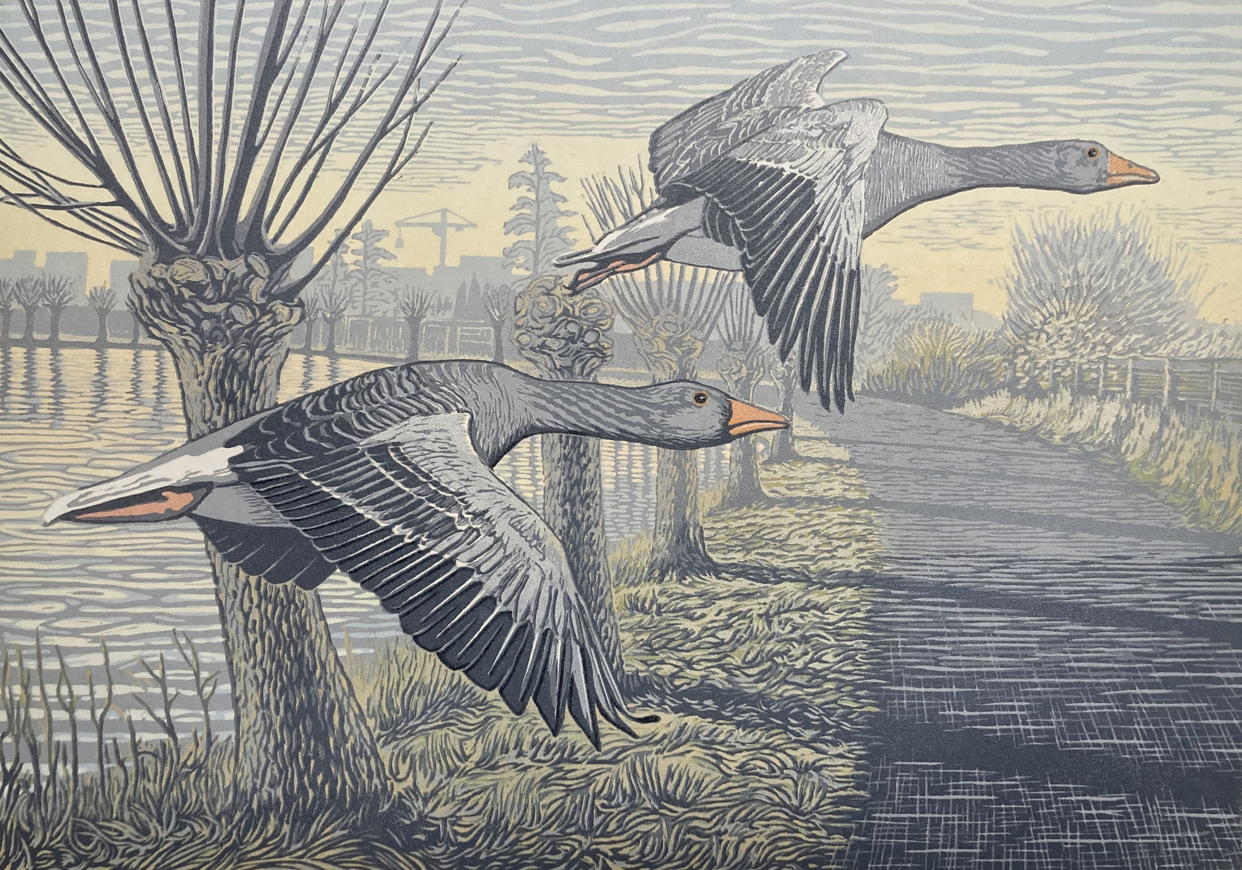 Meerkleuren-lino in acht drukgangen. Opvliegende ganzen in dorps-landschap (Benthuizen met op de achtrgrond oprukkend Zoetermeer). Oplage 9 stuks.