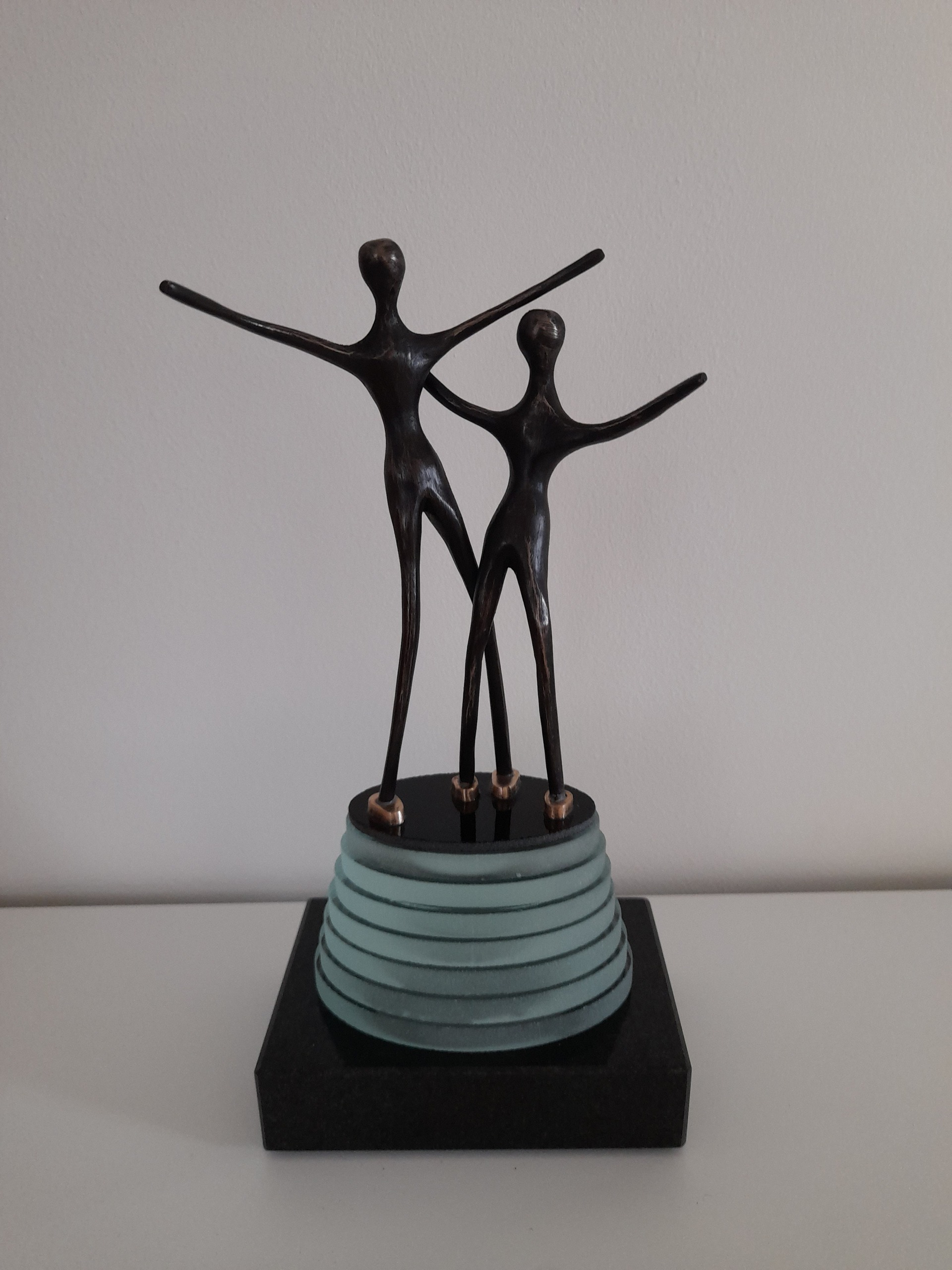 Brons gemaakt volgens de verloren wastechniek. Glas 8 mm dik gesneden door waterstraal