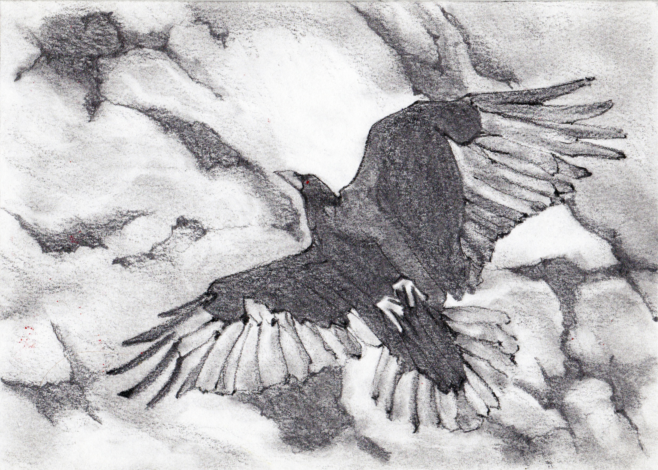 Tekening van een raaf - verwijzing naar het gedicht "the Raven" van Edgar Allen Poe.