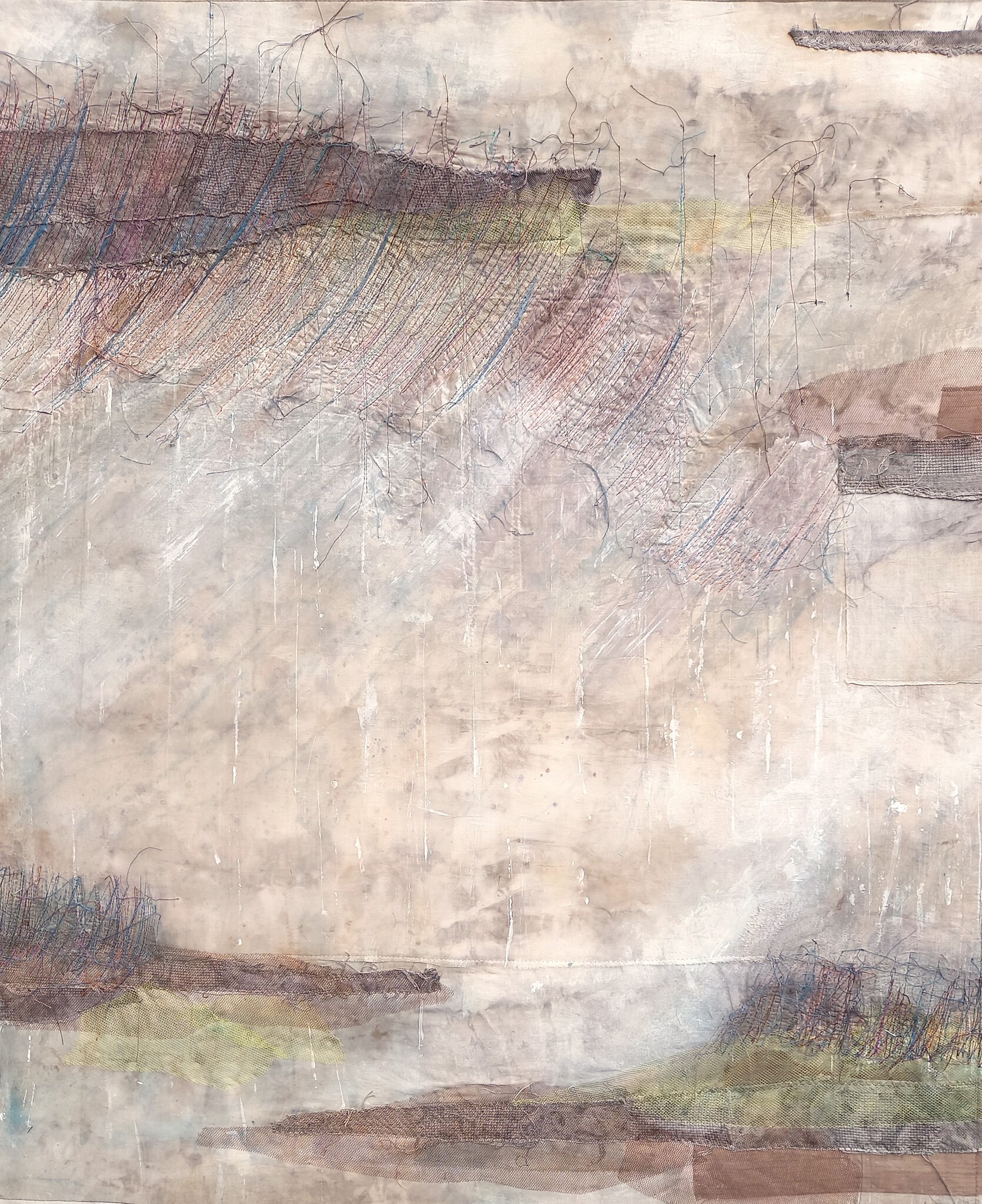 Machinaal borduurwerk op een door middel van eco-dying en verf bewerkte ondergrond lap.