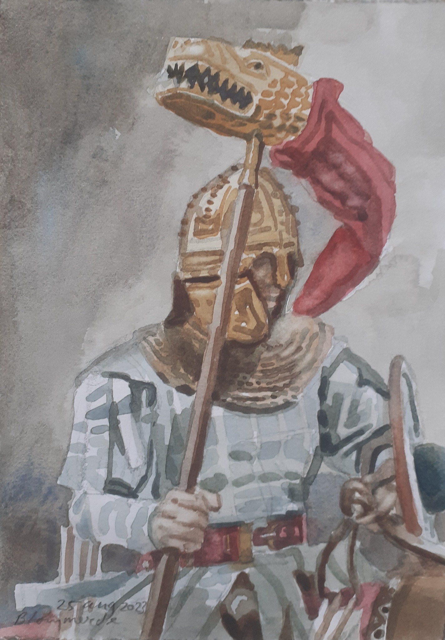 Aquarel van een Romeinse ruiter met een drakenbanier