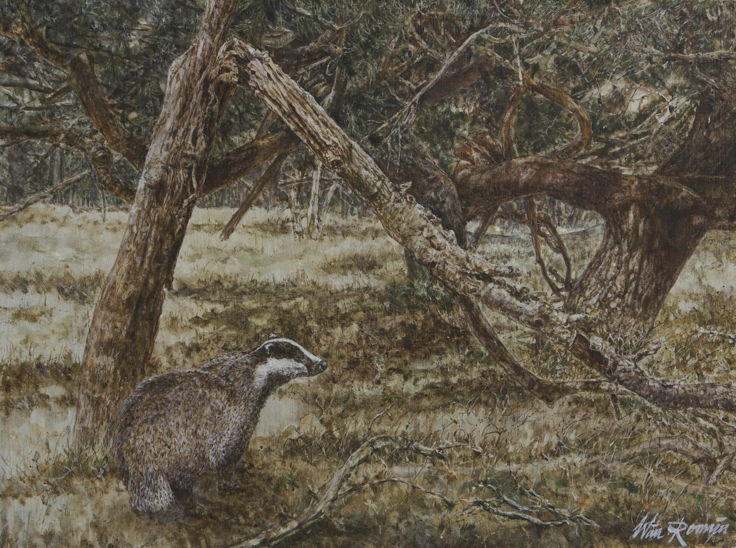 In vroege ochtenduren kwam ik van zeer nabij oog in oog te staan met boommarters, een marterhond en een wolf, diersoorten die niet algemeen voorkomen in onze natuurgebieden. Hoewel ik op de hoogte ben van de aanwezigheid van dassen in een aantal bosgebieden, is het mij niet gelukt overdag een das te zien te krijgen. Ieder jaar worden dassen geteld (beschermd diersoort) door bij burchten (holen) te posten. Te samen met medewerkers van een dassenwerkgroep, Staatsbosbeheer, Natuurmonumenten of een Stichting Landschap bracht ik zwijgend veel tijd door in het zicht van een burcht; staand, zittend of knielend, verstopt achter een boom, struik of heuveltje, rekening houdend met de windrichting. Bij pech met muggenbulten, ontgoocheld naar huis, bij geluk kregen we in de schemering een dassenfamilie te zien. Gedurende twee jaren nam ik deel aan groepsexposities met werken van Nederlandse en buitenlandse wildlifeschilders. De grootste expositie telde meer dan 400 aquarellen en olieverfschilderijen. Onderwerpen waren vogels (heel populair), de Europese fauna en van de Canadese wildernis tot de diersoorten van de Afrikaanse savannes toe. Slechts één klein portret van een das kreeg ik te zien. Het feit dat dassen nachtdieren zijn en daardoor niet zo bekend bij het grote publiek, speelt mijns inziens een rol waarom dassen niet vaak geschilderd worden.