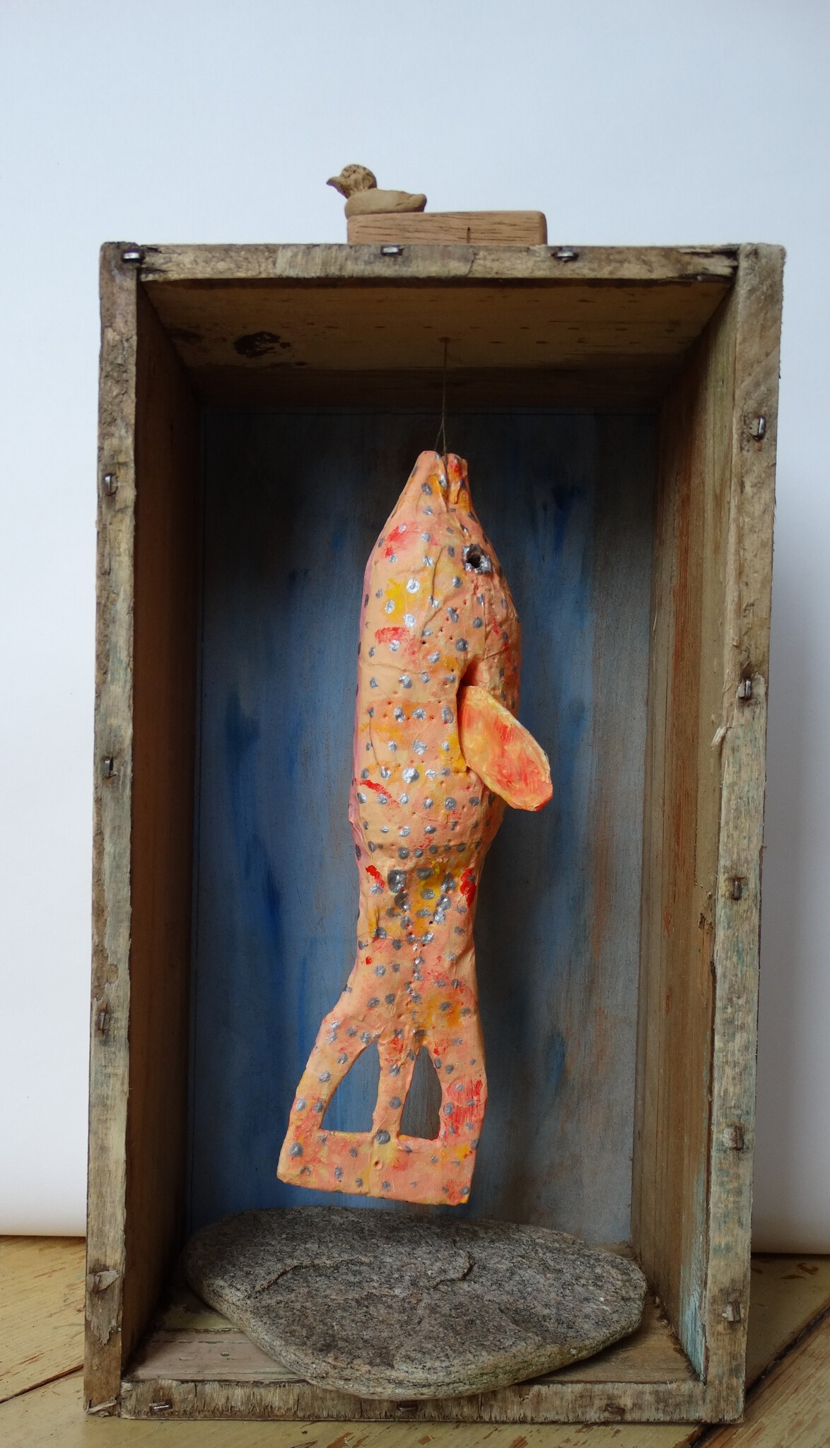 Vis hangt aan een dun draadje, via het blokje bovenop het bakje kan de vis draaien.