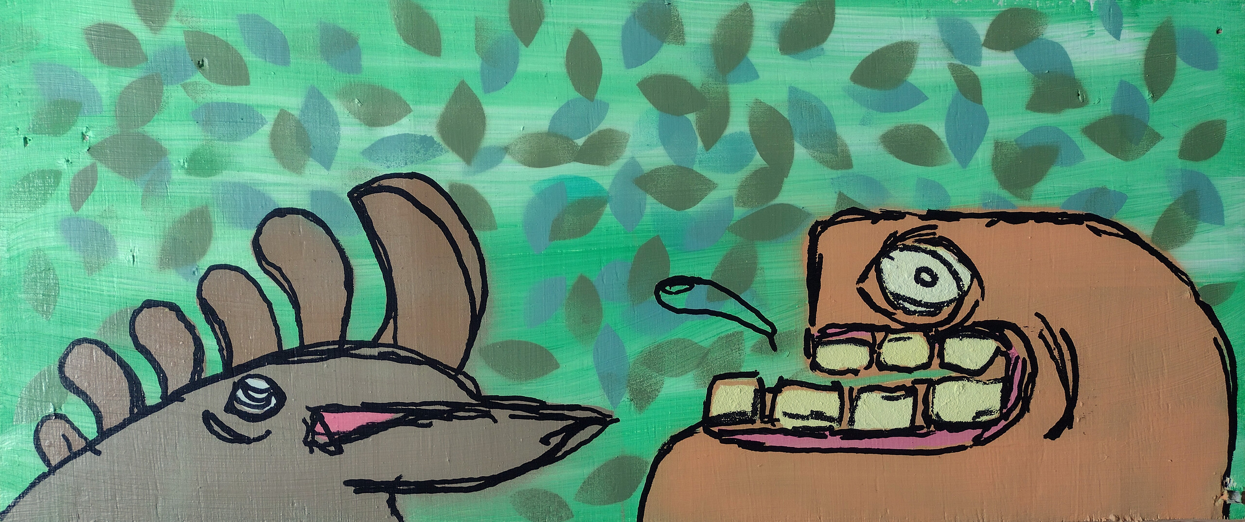 Spuitbus met verfstift op hout, handgesneden sjablonen.