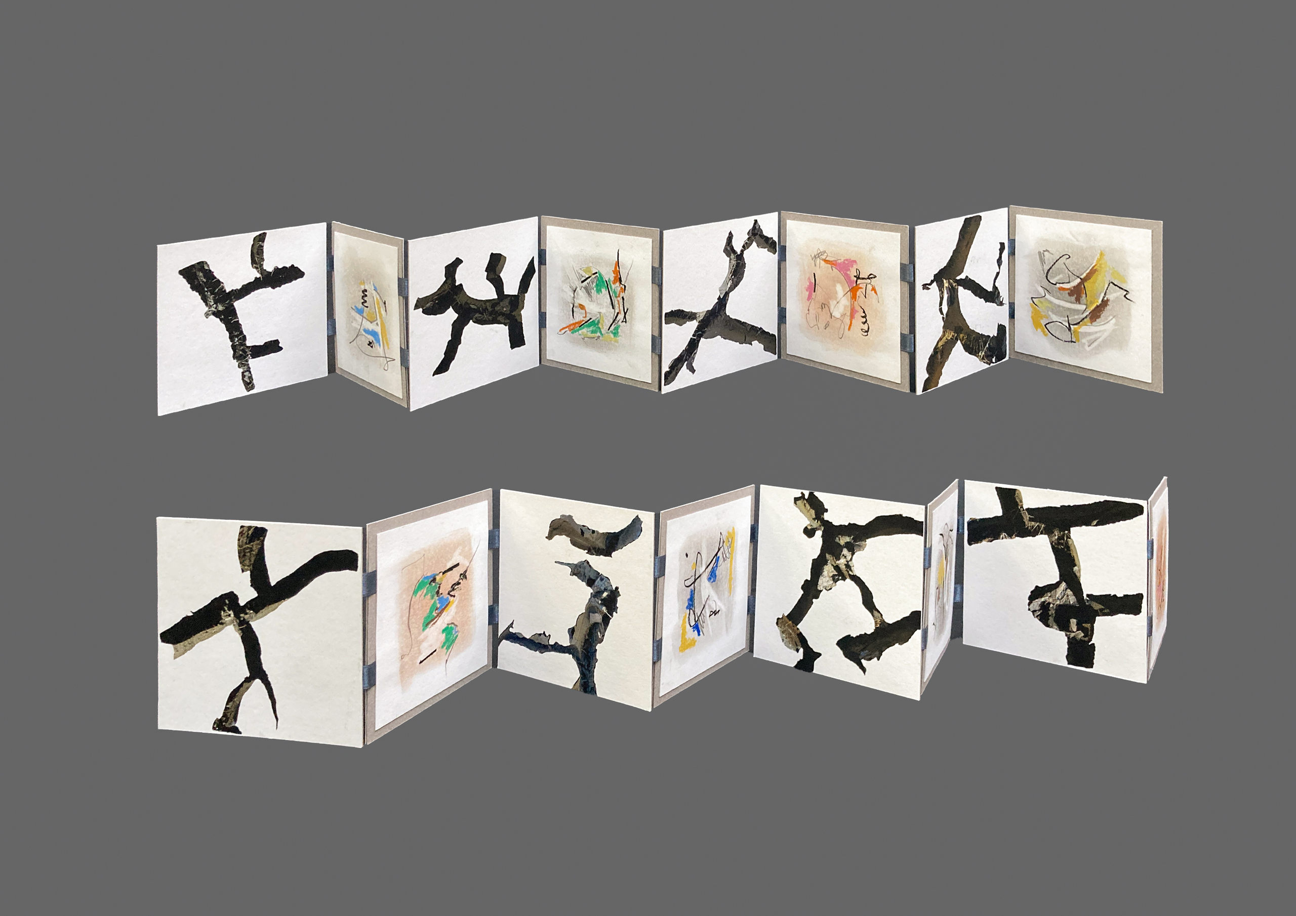 Leporello bestaande uit 8 foto's en 8 tekeningen van 9,5 x 9,5 cm. Opgevouwen 2 cm hoog, uitgevouwen ca 60 cm
