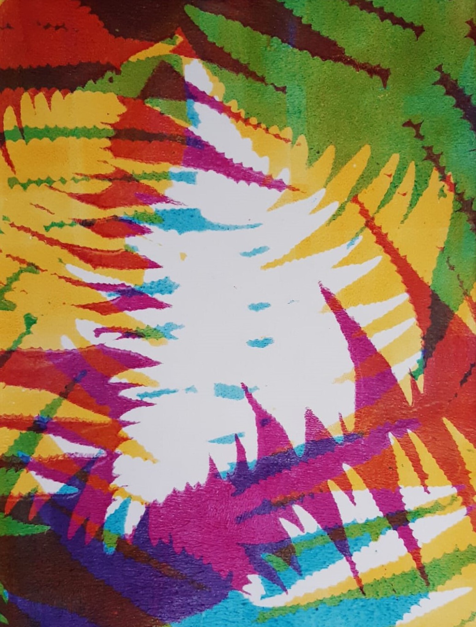 Bladerwerk serie, prints met acrylverf en bladmateriaal op de gelliplaat. Het gaat het best in de zomer als er vers blad is aan bomen en planten. Monoprint: een unieke afdruk met hoge kwaliteit acrylverf (open acrylic van Golden). Drie kleuren, drie lagen. Door het kleurgebruik vooral voor avontuurlijk ingestelde natuurliefhebbers. De afdruk meet bij benadering 20 bij 25 cm. Kan worden geleverd in een passepartout in de gangbare buitenmaat 30 bij 40 cm.