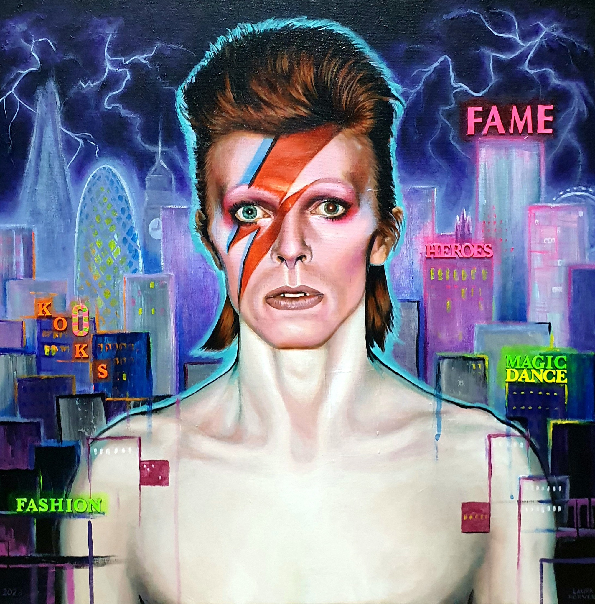 Iconische zanger, acteur, ontwerper en kunstenaar. Inspireert tot op de dag van vandaag wereldwijd met zijn grensverleggende, taboe-doorbrekende, gewaagde en prachtige werk. Daarmee is hij nog steeds 'Hero' voor velen, zoals zangeres Lady Gaga, die net als hem poseerde met de bliksemschicht op het gezicht. Tweeluik met het schilderij 'Heroes - Lady Gaga'.