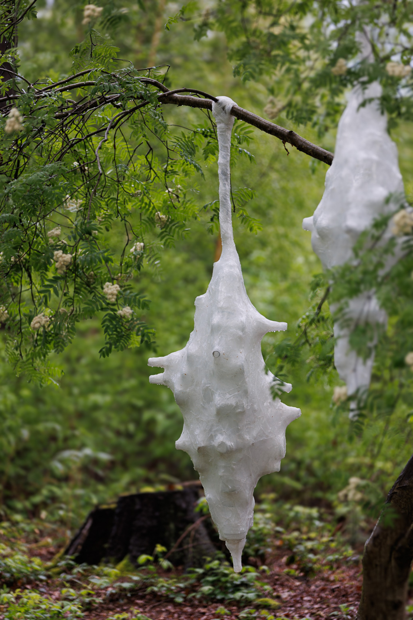 Cocoons; Hanging from trees like fruits of an apocalyptic landscape of out-of-control consumer rage.