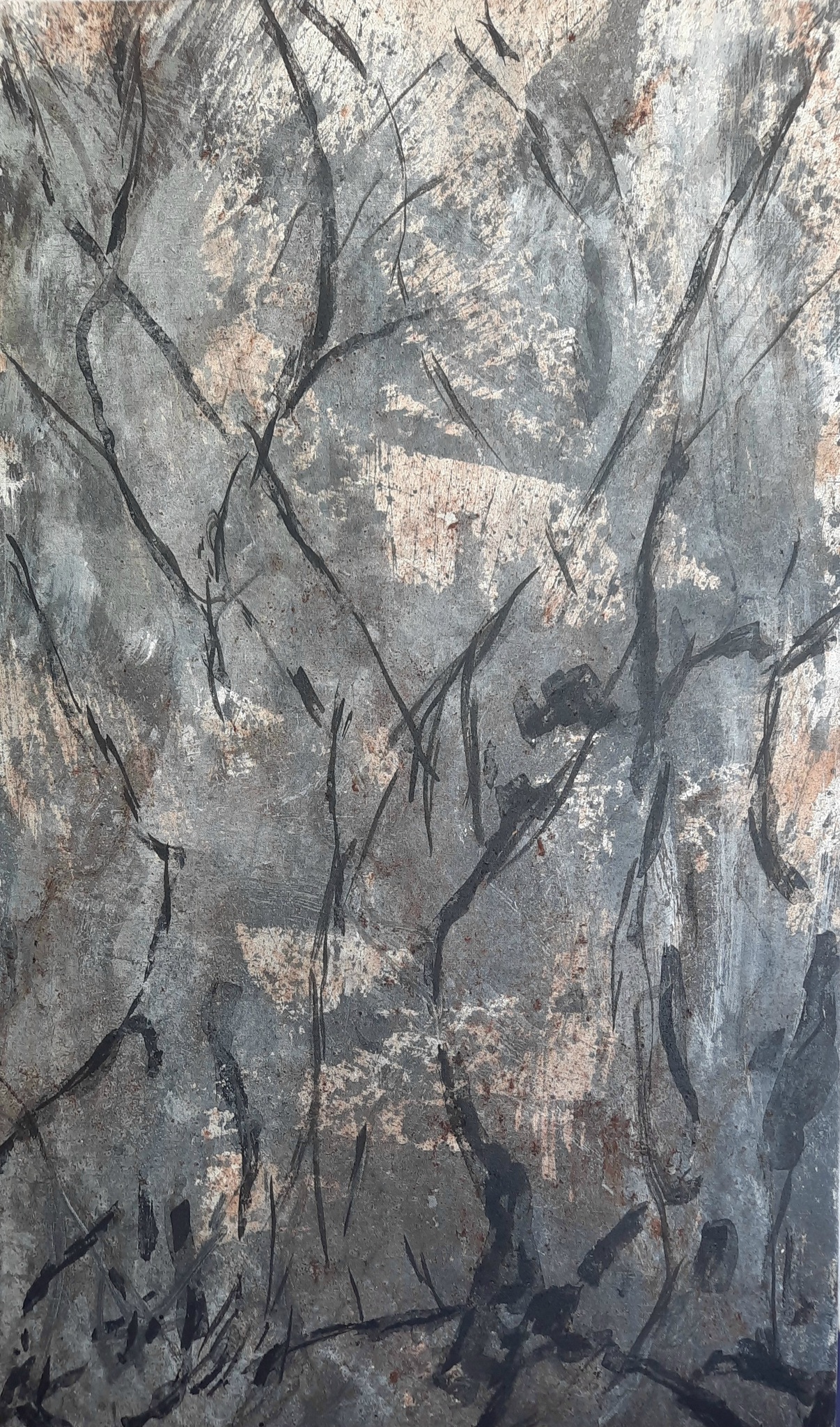 Dit werk is gemaakt met as, verkoold hout en rode aarde. Verzameld bij een bosbrand in de buurt van ons dorp. Het zijn stille getuigen van de verwoestingen, die ontstaan door de klimaatsverandering.