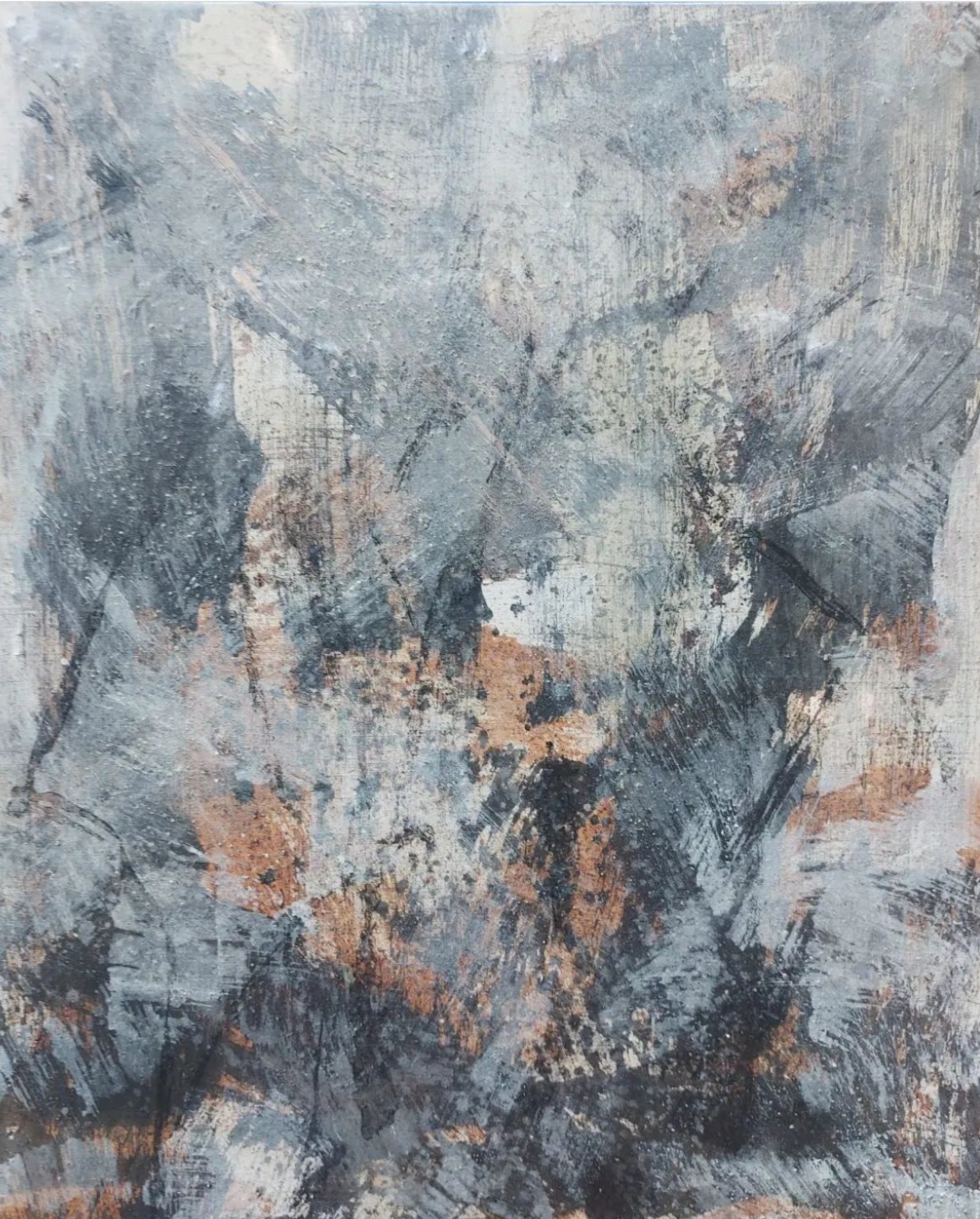Na een bosbrand in een naburig dorp in Griekenland heb ik daar pigmenten verzameld. As, verkoold hout en rode aarde, daarmee heb ik een ei-tempera schilderij gemaakt.