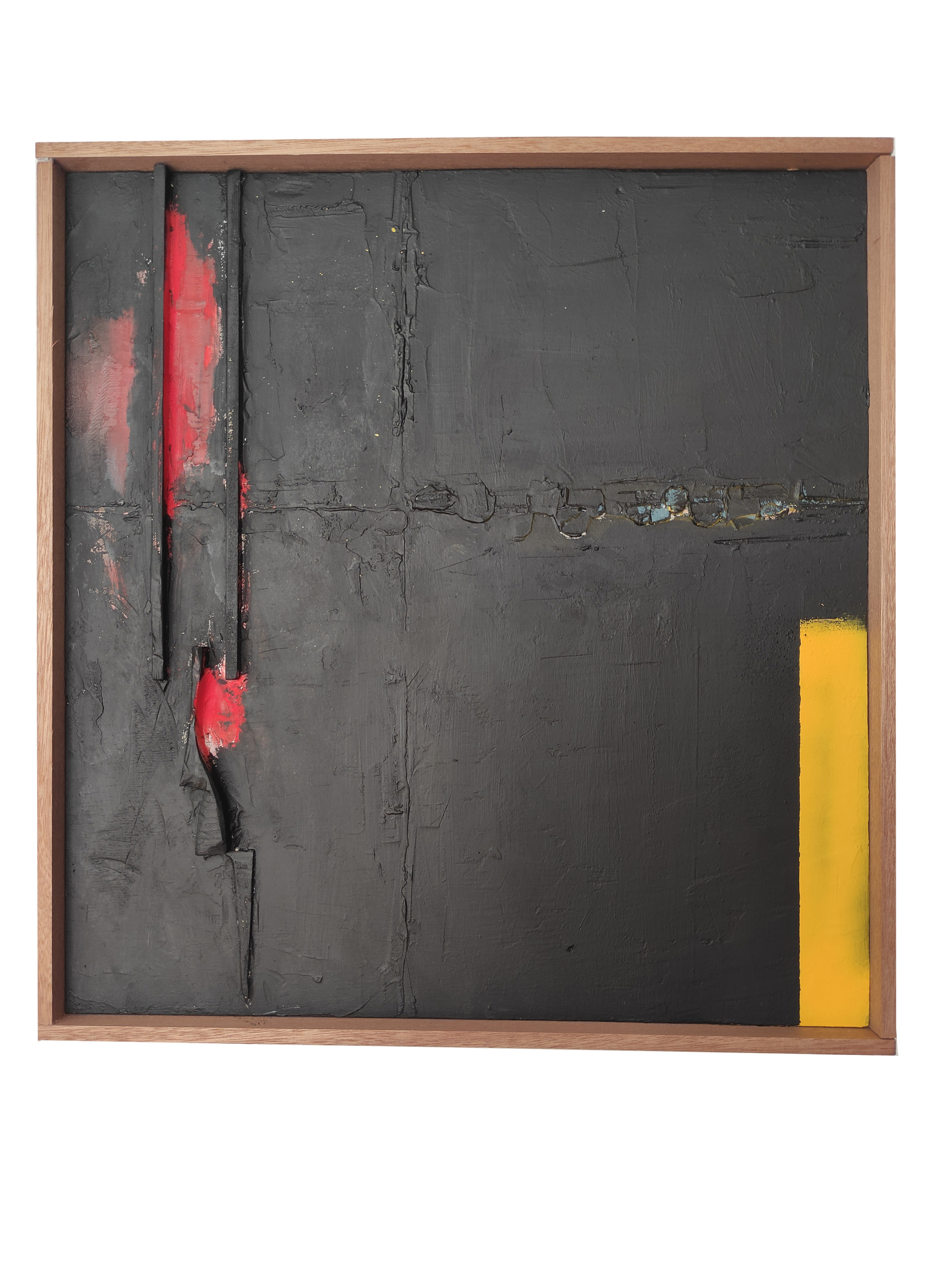 Schilderij in lijst, vervaardigd als collage met hout en pleisterwerk, en met verf op board.