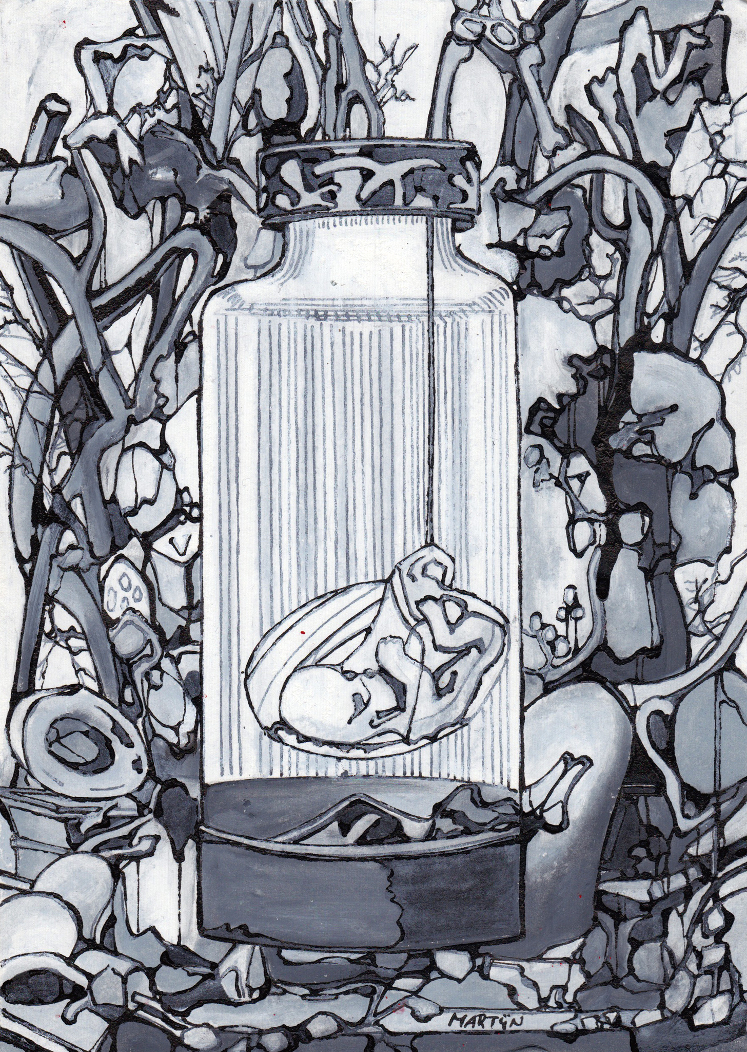 Tekening gebaseerd op een preparaat van de Nederlandse anatoom, zoöloog en botanicus Frederik Ruysch (1638 - 1731). Hij presenteerde zijn preparaten net als de anatomische tekeningen van Andreas Vesalius/ Jan Steven Kalkar als kunstwerken of lugubere composities, waardoor het onderscheid tussen kunst en wetenschap vervaagde.