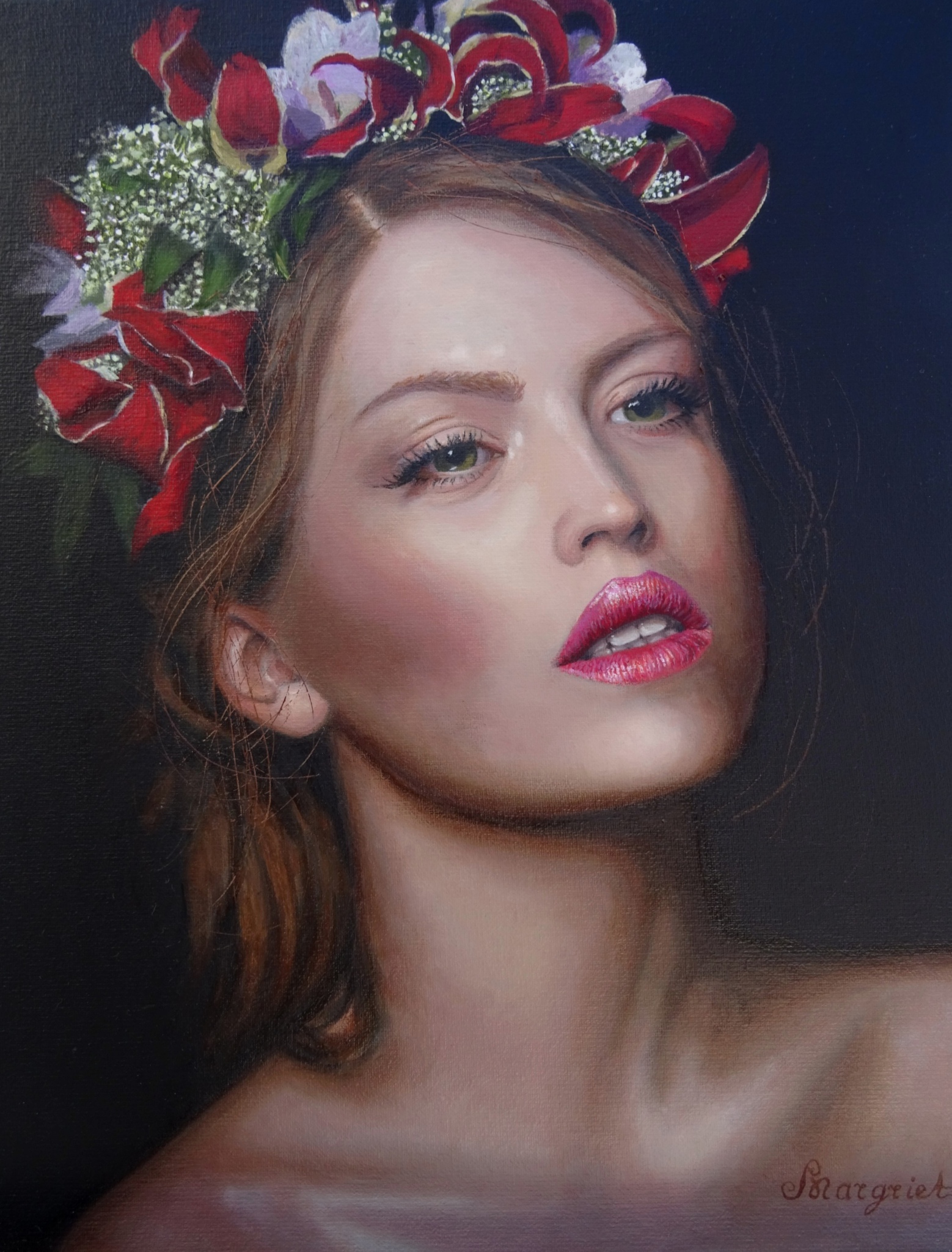 Schilderij Rood Bloemen Vrouw Portret Van Woman Olieverf Schilderkunst Oilpaint Galerie De Flowers Oude Atelier Betuwe Schilderen Sensueel Klassiek Meesters Grisaille Margriet Zoelmond Schilderles Bie