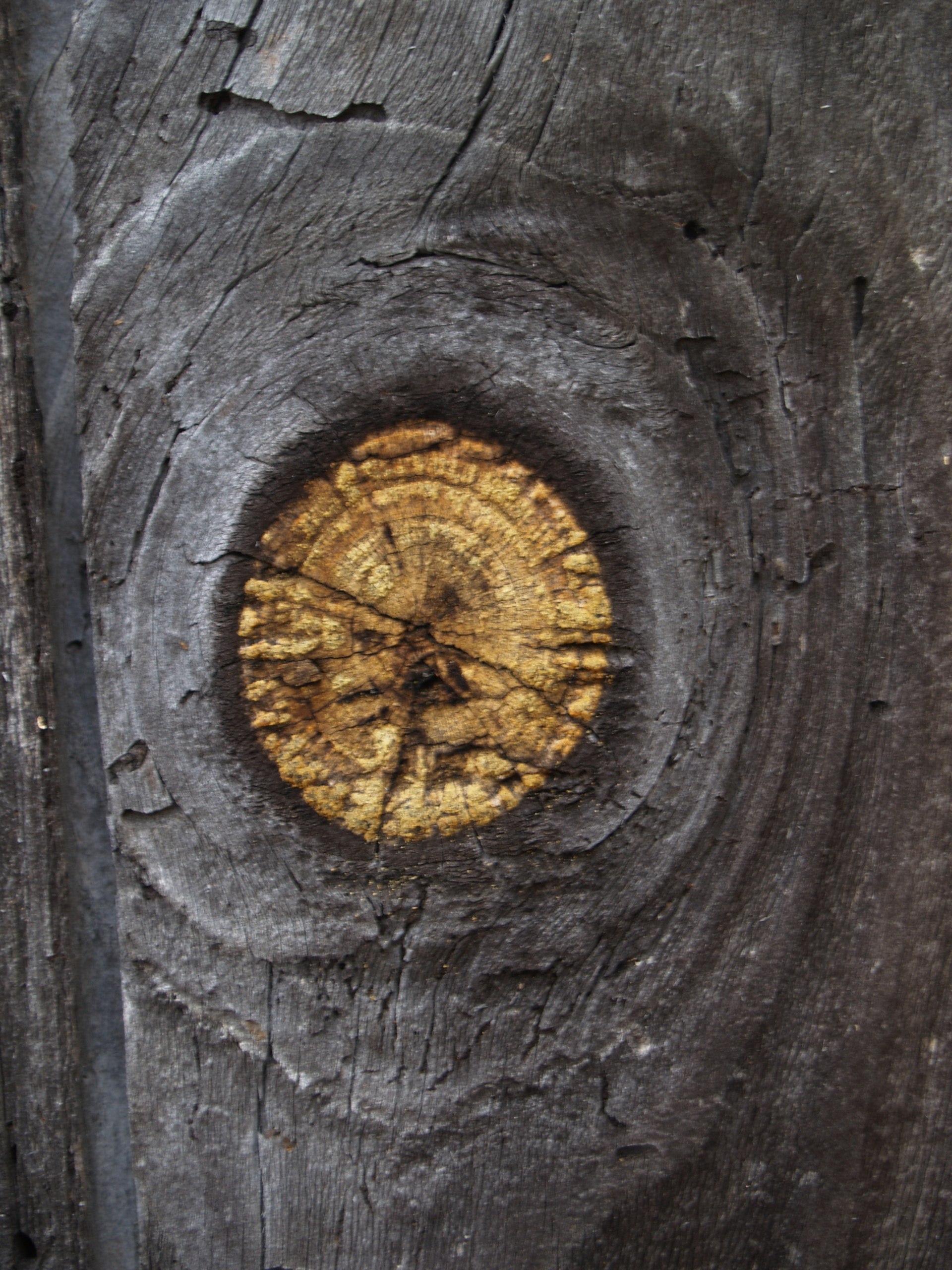 Knoest in een stuk gebrand hout. Mooi contrast. Ingelijst in glas in 10 cm. breed passepartout.