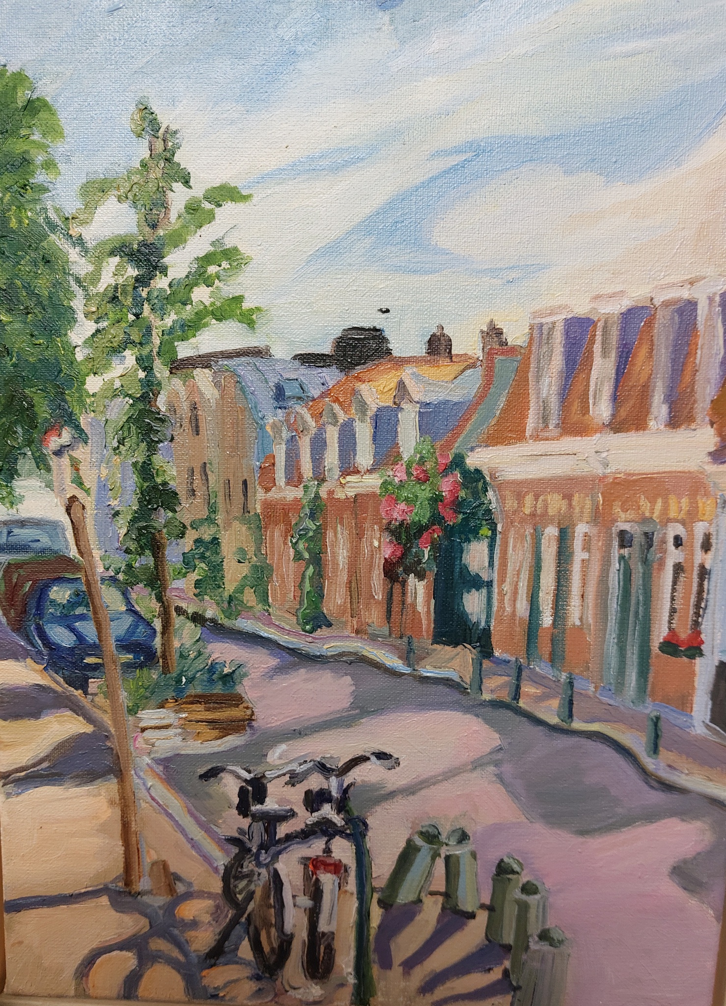 Amsterdam Olieverfschilderij Straatje Fiets Fietsen Auto Stad Huisjes Stadsgezicht Schattig Pleinair Cityscape Amsterdamwest Pleinairschilderij Slatuinenweg Oilpaninting Kleinehuisjes