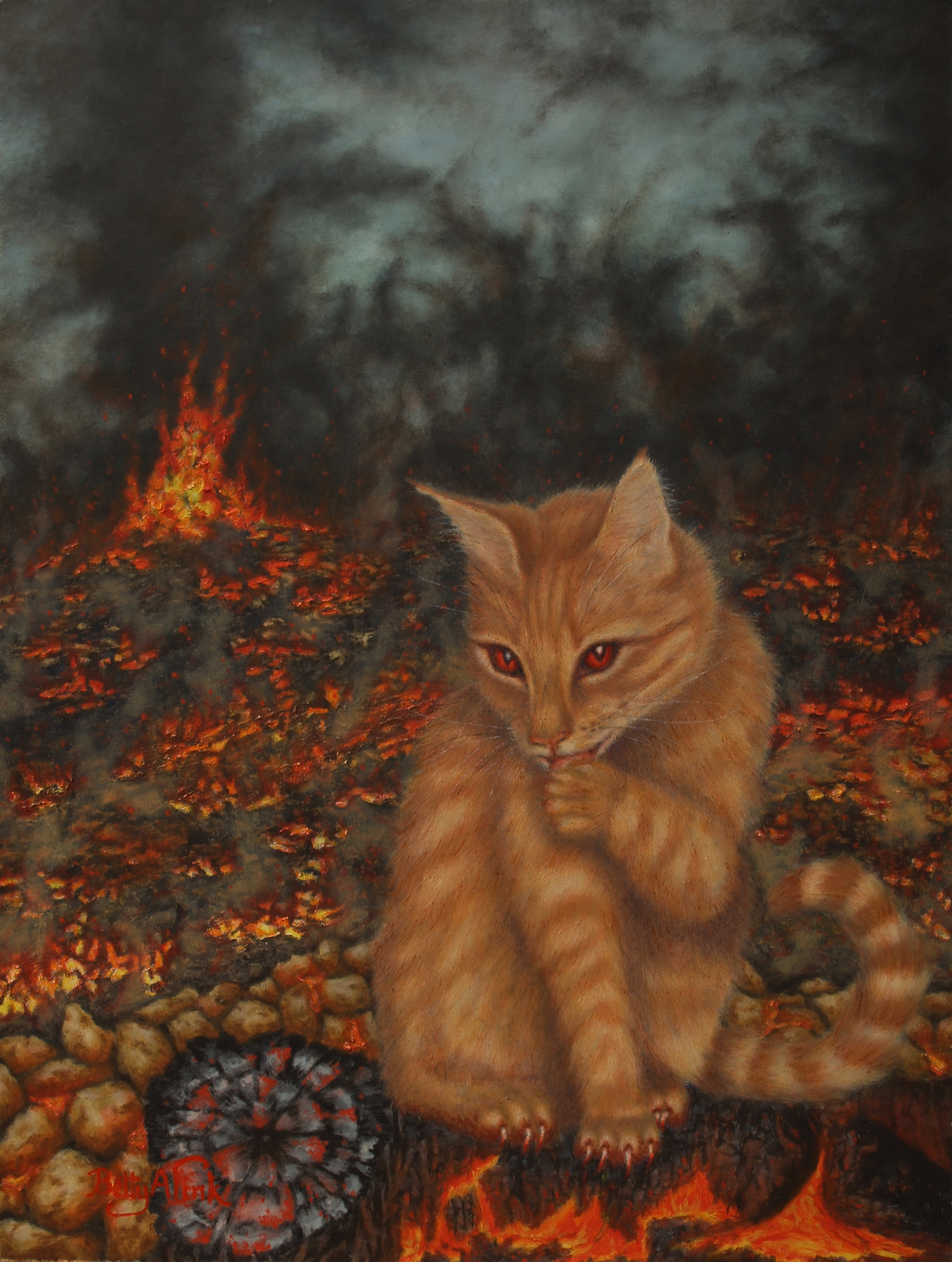 Telling Tails II. Deel 2 van een 4-luik. Het 4-luik verhaalt van dreiging, onheil, schamel begin en nieuwe start. Het 4-luik is bedoeld om samen te blijven. In uitzonderlijke gevallen kan hier eventueel van afgeweken worden. Prijs voor het gehele 4-luik is € 1995,-; voor een enkel schilderij € 765,-.