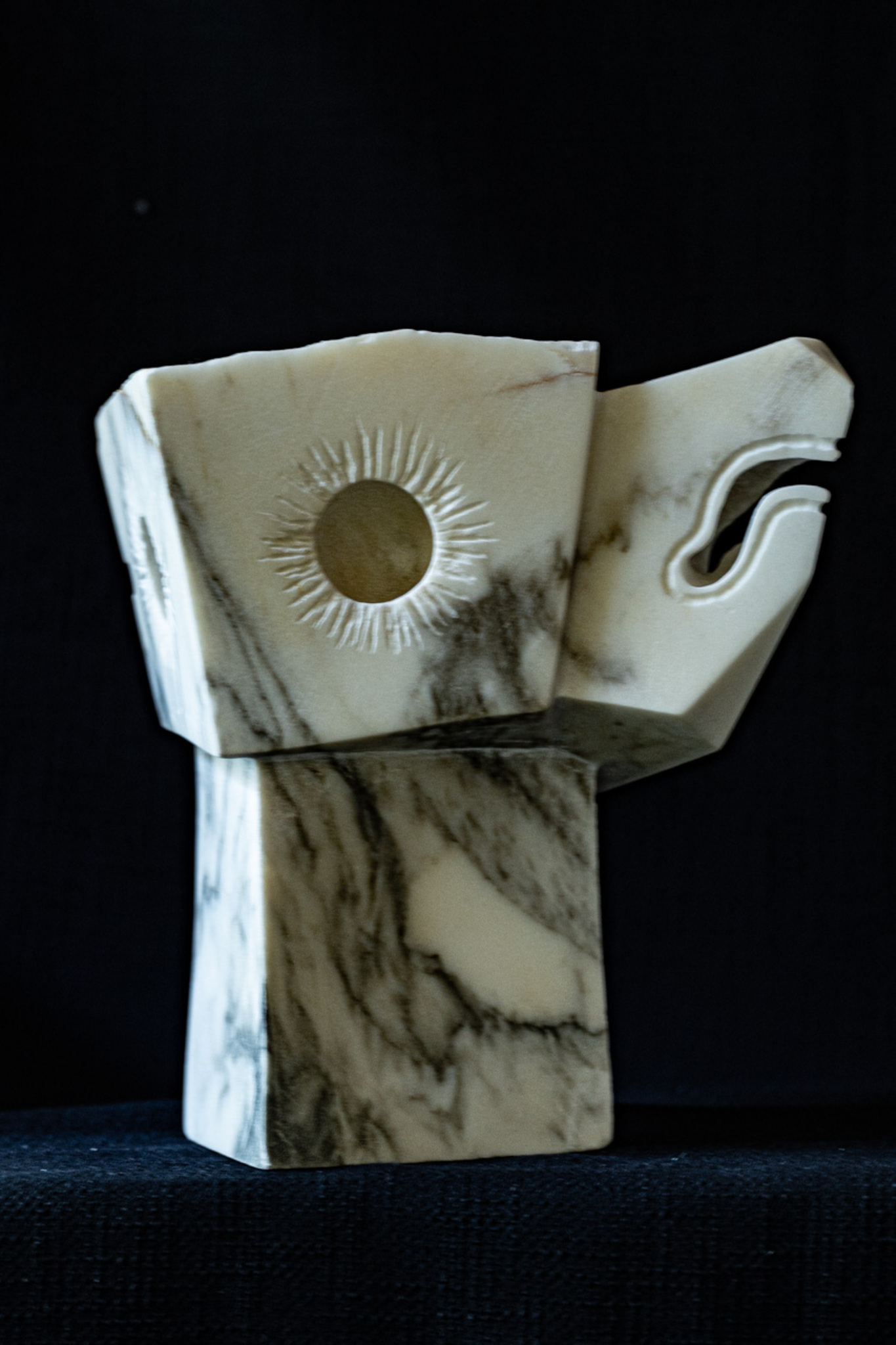 Deze marmeren sculptuur combineert strakke en vrije vormen die elkaar verdragen en versterken.