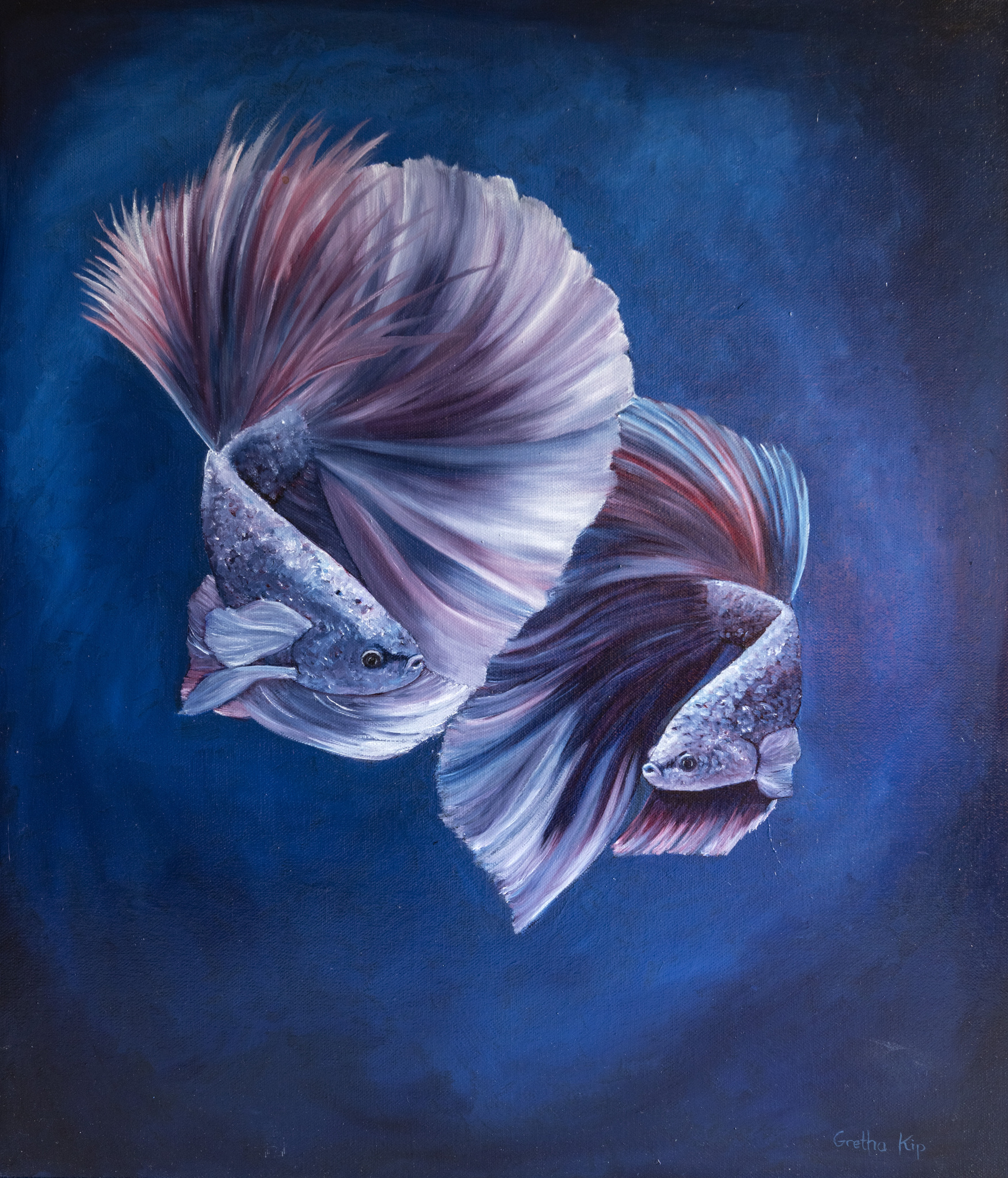 Schilderij Blauw Olieverf Lila Vissen Kempvissen