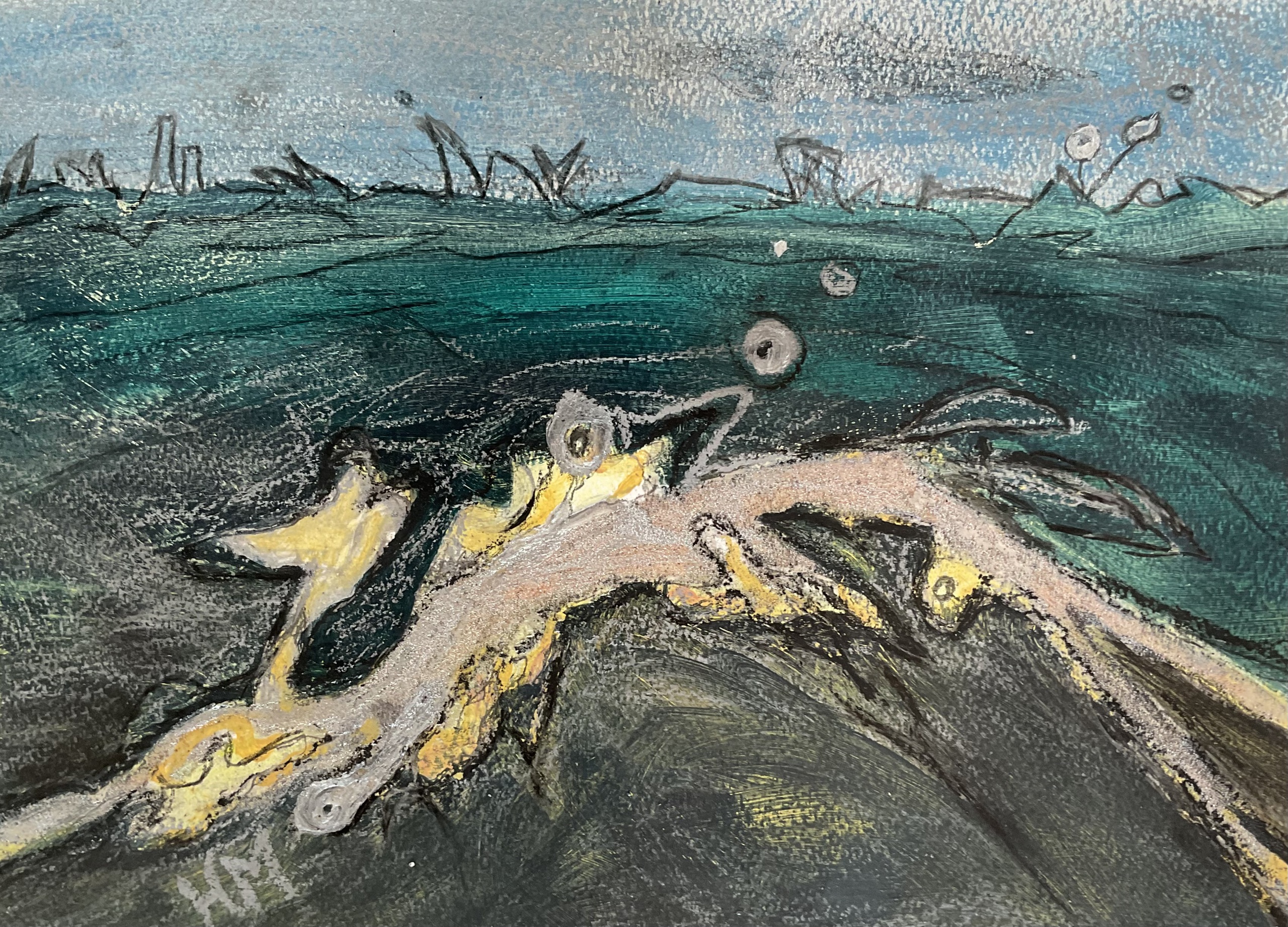 Acrylverf, zand, oliepastel en potlood op 300 g/m2 aquarelpapier.